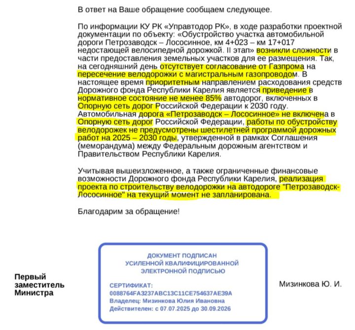 В Минтрансе также отметили, что сейчас приоритет — приведение в нормативное состояние опорных дорог к 2030 году, а работы по обустройству велодорожек «не предусмотрены шестилетней программой дорожных работ на 2025—2030 годы». Что касается велодорожки до Лососинного, ее строительство, судя по ответу Минтранса Карелии, вообще не запланировано.