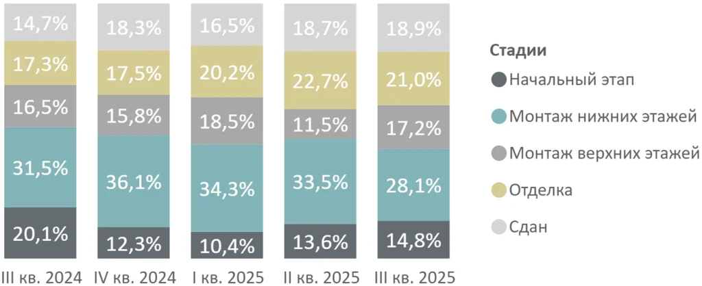 В структуре предложения по стадиям строительной готовности не произошло значительных изменений. За квартал выросла доля предложения на этапе котлована (14,8%, +1,2 п.п.) и на этапе монтажа этажей (45,3%, +0,3 п.п.). В корпусах на этапе отделки доля сократилась (21%, -1,7 п.п.).