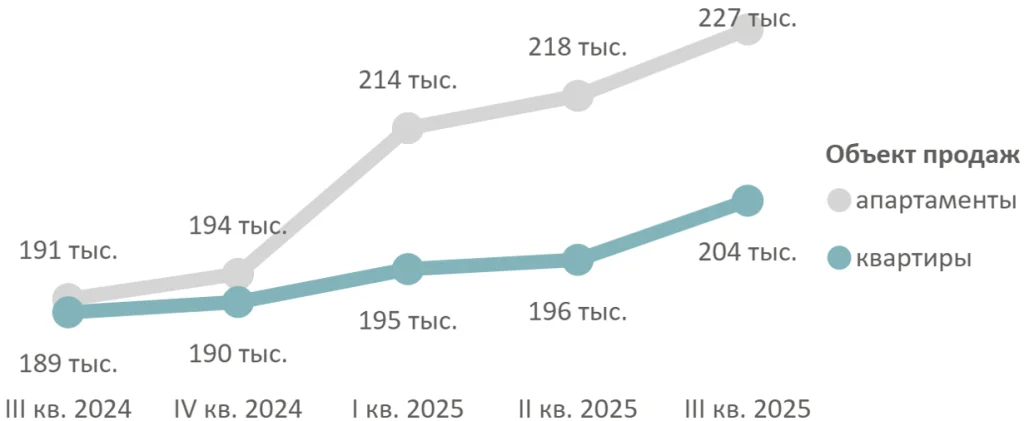 Эксперты компании «Метриум» отметили, что средневзвешенная цена квадратного метра квартир и апартаментов по итогам III квартала 2025 года составила 204,6 тыс. рублей (+4% за квартал, +8% за год). Средневзвешенная цена квартир - 204 тыс. рублей за кв. метр (+4% за квартал, +8% за год), апартаментов - 227 тыс. рублей за кв. метр (+4% за квартал, +19% за год).
