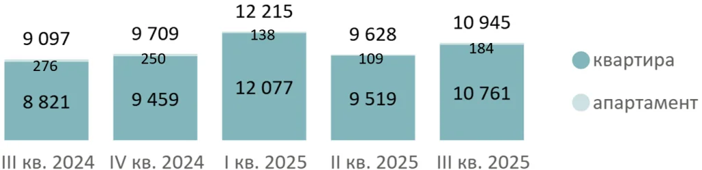 В III квартале 2025 года на рынке новостроек Московской области было зарегистрировано 10,9 тыс. ДДУ (+14% за квартал, +20% за год). В сентябре было зарегистрировано максимальное число сделок (3,9 тыс. ДДУ), минимальное – в июле (3,5 тыс. ДДУ).