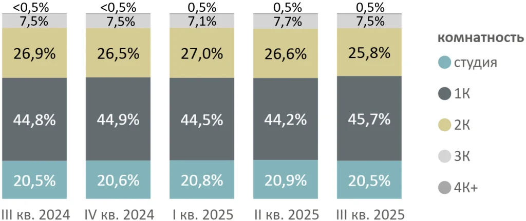 В распределении предложения по типологии отмечается рост доли однушек (45,7%, +1,5 п.п. за квартал) при сокращении доли студий (20,5%, -0,4 п.п.), двухкомнатных (25,8%, -0,8 п.п.) и трехкомнатных (7,5%, -0,2 п.п.) форматов.