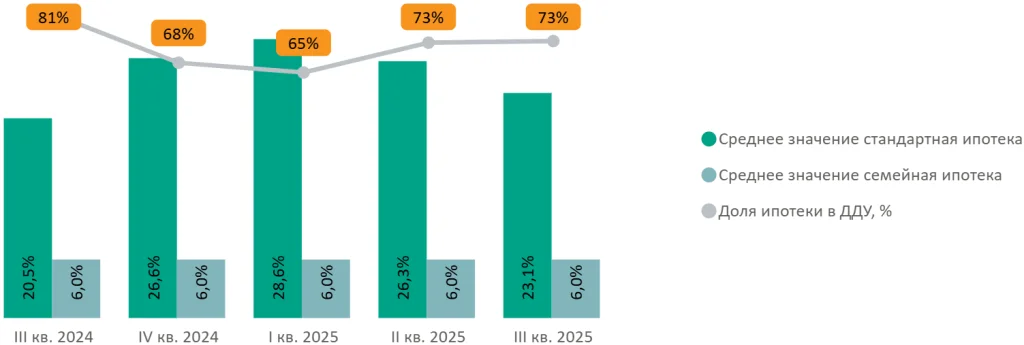 Доля сделок с привлечением ипотечного кредита в III квартале составила 73% (без изменений за квартал, -8 п.п. за год).