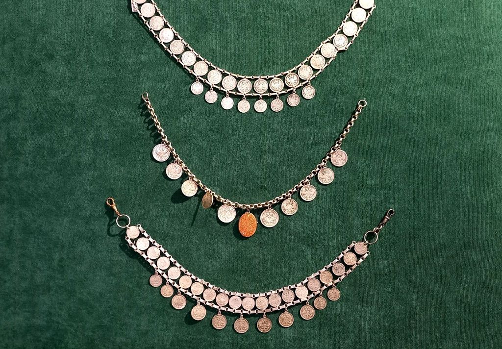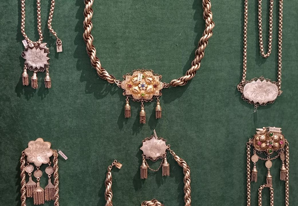 Также посетители увидят цепи разнообразного плетения с подвесками в виде колокольчиков и монет, украшения из крупных полых бусин, ожерелья с листовидными подвесками, браслеты и серьги.