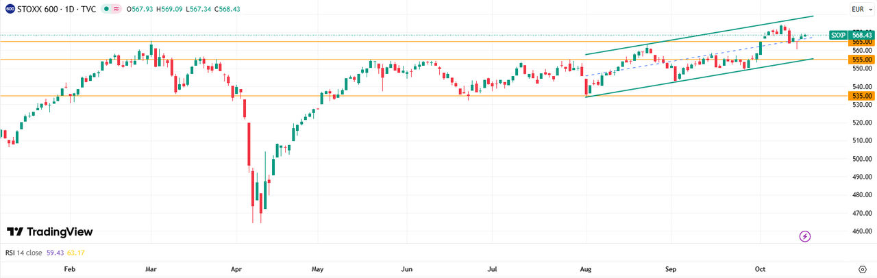 STOXX 600 торгуется около 568,7 пункта и продолжает восстановление после краткосрочной коррекции, сохраняя потенциал для дальнейшего плавного роста в рамках среднесрочного восходящего тренда. RSI (59,7) подтверждает отсутствие перегретости, рынок выглядит устойчивым: после пятничного отката спрос возвращается к поддержке на уровне 565 пунктов. Это формирует благоприятную техническую картину для продолжения умеренного восходящего движения в ближайшие сессии.