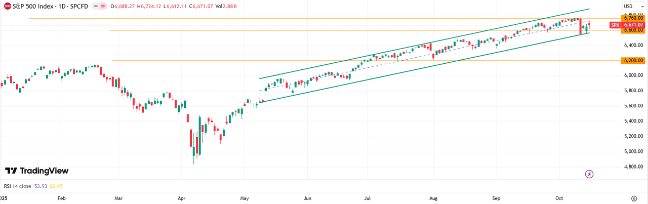 Индекс S&P 500 остается в фазе восстановления после резкой просадки в пятницу, закрывшись на уровне 6671 пункт. В краткосрочной перспективе динамика рынка будет определяться реакцией на тест сопротивления вблизи исторических максимумов, а также способностью покупателей удержать поддержку 6600.