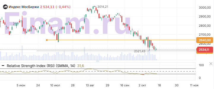 Индекс МосБиржи торгуется у поддержки на 2521. Перепроданность в сочетании с отсутствием новых позитивных драйверов делает покупки на отскок рискованным сценарием. Ближайшая перспектива — движение в боковике 2520–2640 пунктов с высокой чувствительностью к новостному фону.