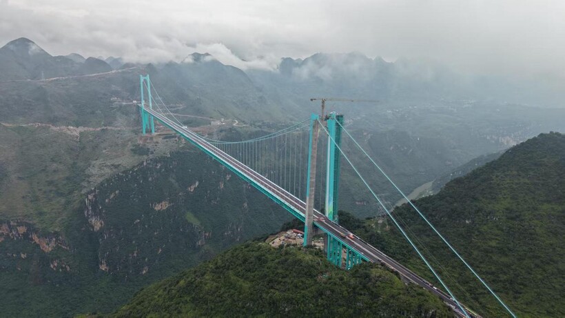 Грандиозное сооружение появилось в провинции Гуйчжоу, и оно соединило две стороны ущелья Хуацзян. Далеко под мостом протекает река, он возвышается над водоемом на головокружительных 625 метров. Это сразу же сделало его абсолютным рекордсменом среди подобных конструкций.