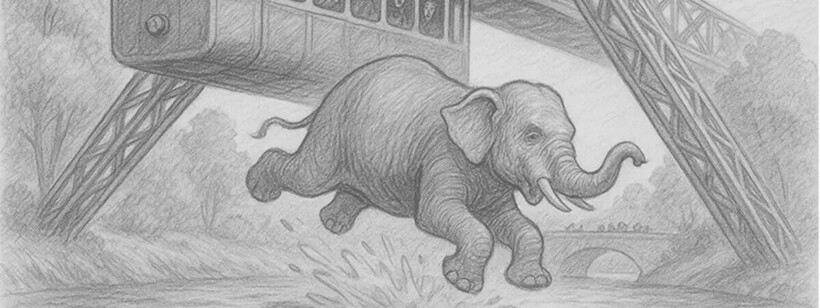 ">Испуганная Туффи повернулась к окну и несколько раз ударила по нему. Стекло и стена не выдержали и сломались, а слониха выпрыгнула прямо в реку, протекающую под путями. Место падения оказалось рядом с аптекой, которая (по поразительному совпадению!) уже больше трех десятилетий носила название «Слоновья аптека».