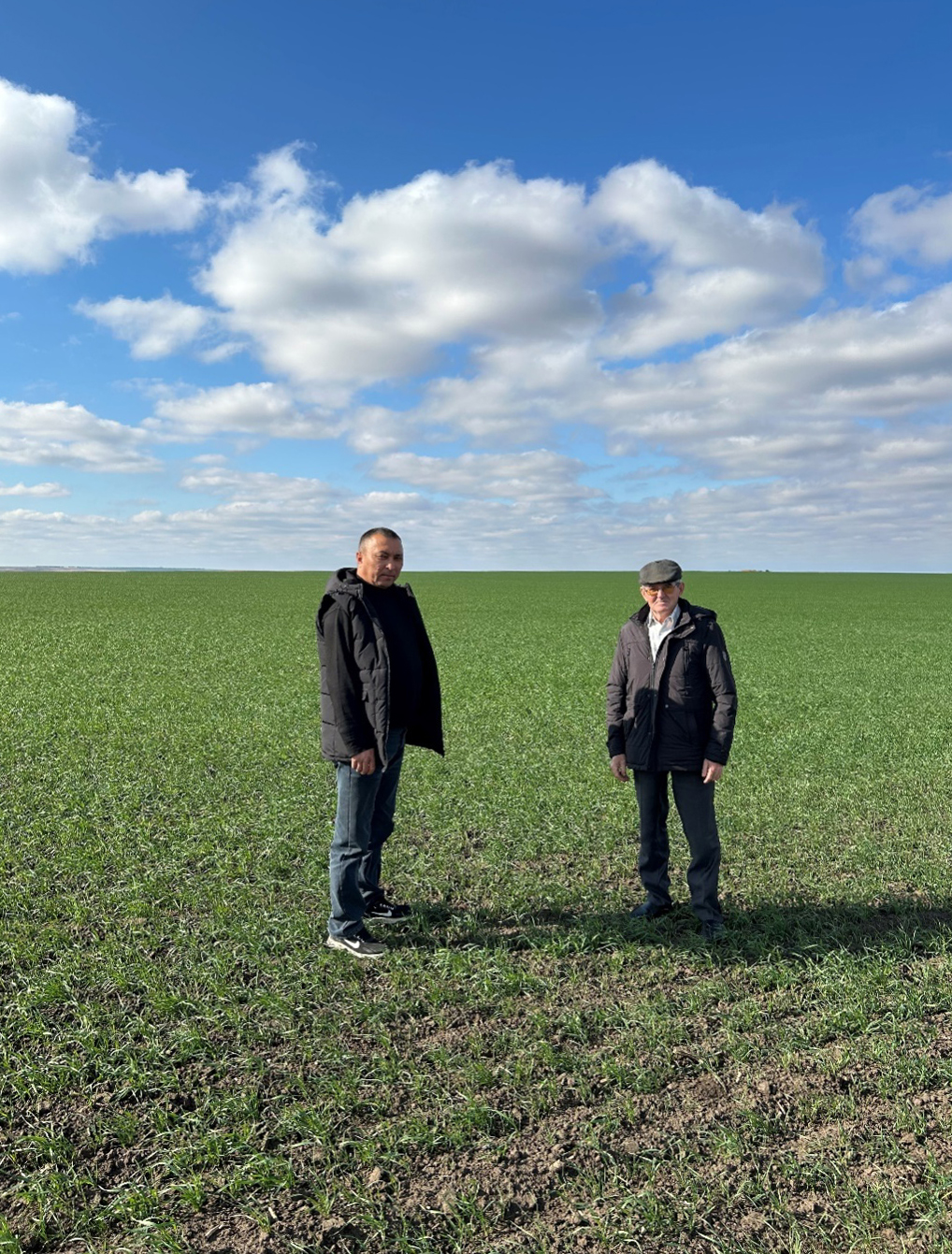 Руководитель СПК «Колхоз Авангард» Кадияров Кайрула Рашитович и главный специалист отдела сельского хозяйства Терновский Юрий Леонидович на поле озимой пшеницы