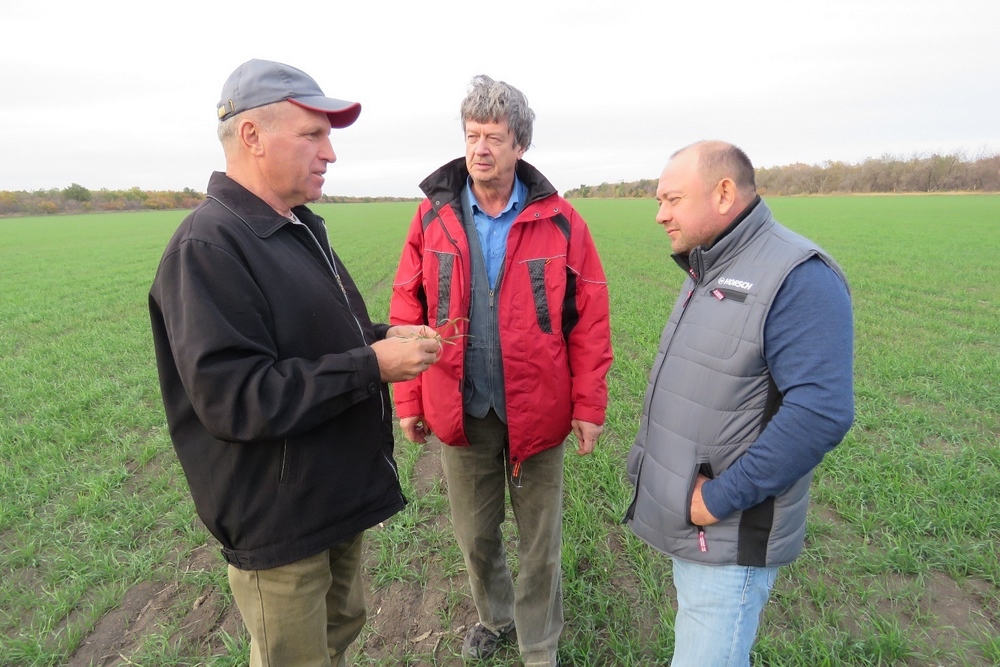 На полях озимой пшеницы проведена оценка уровня развития растений и общего состояния всходов перед завершением осенней вегетации по степени развития биологической массы. Установлено хорошее и удовлетворительное состояние растений, находящихся в стадии осеннего кущения, с 2-3 побегами и развитой первичной корневой системой. Отмечено, что активному развитию вторичной корневой системы из подземного стеблевого узла, на 40-50% определяющей величину урожая зерновых в засушливых условиях степной зоны, пока препятствует отсутствие влаги в верхнем слое почвы. В то же время сделано заключение, что при улучшении условий увлажнения продолжительности тёплого осеннего периода ещё вполне достаточно для её полноценного развития, оптимальной закалки растений и успешной перезимовки.