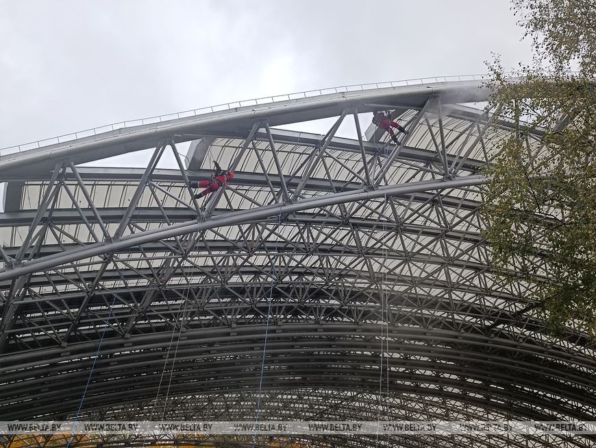 По словам заведующего филиалом, для определения состояния крыши над зрительным залом проводилось экспертное обследование. В результате от замены поликарбонатного покрытия козырька, что было задумано изначально, отказались. Вместо этого промышленные альпинисты из новополоцкой строительной компании взялись за гидроструйную очистку. Первые дни работы показали хороший результат, крыша стала светлее. После очистки на нее нанесут специальное защитное покрытие, которое продлит срок службы на десятки лет. Общая площадь поликарбонатной крыши составляет около 5 тыс. кв.м.