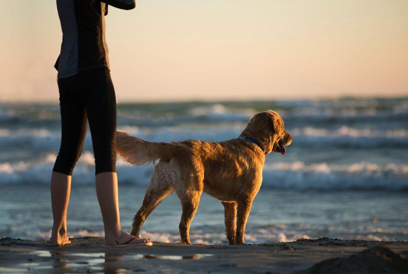 Хозяин с собакой на морском пляже