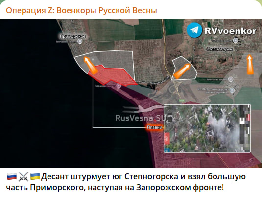 Согласно последним данным, на левом фланге Запорожского направления наши войска после взятия Плавней контролируют около 2/3 Приморского, расположенного вдоль берега Каховского водохранилища. ВСУ время от времени пытаются контратаковать с северо-запада. Неудачно.