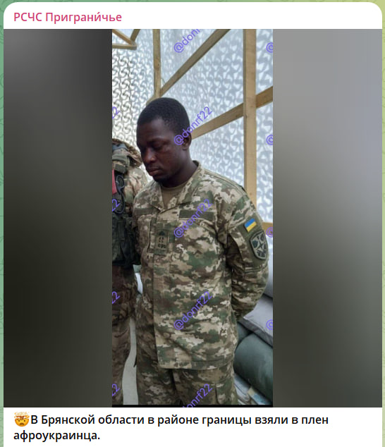 Удивительные новости пришли с другого участка Северного фронта. По данным канала "РСЧС Приграничье", в Брянской области в районе границы взяли в плен "афроукраинца". Военкор канала "Синяя Борода" отмечает, что эта новость — своего рода сенсация, поскольку в плен смуглый наёмник попал впервые на Северном фронте.