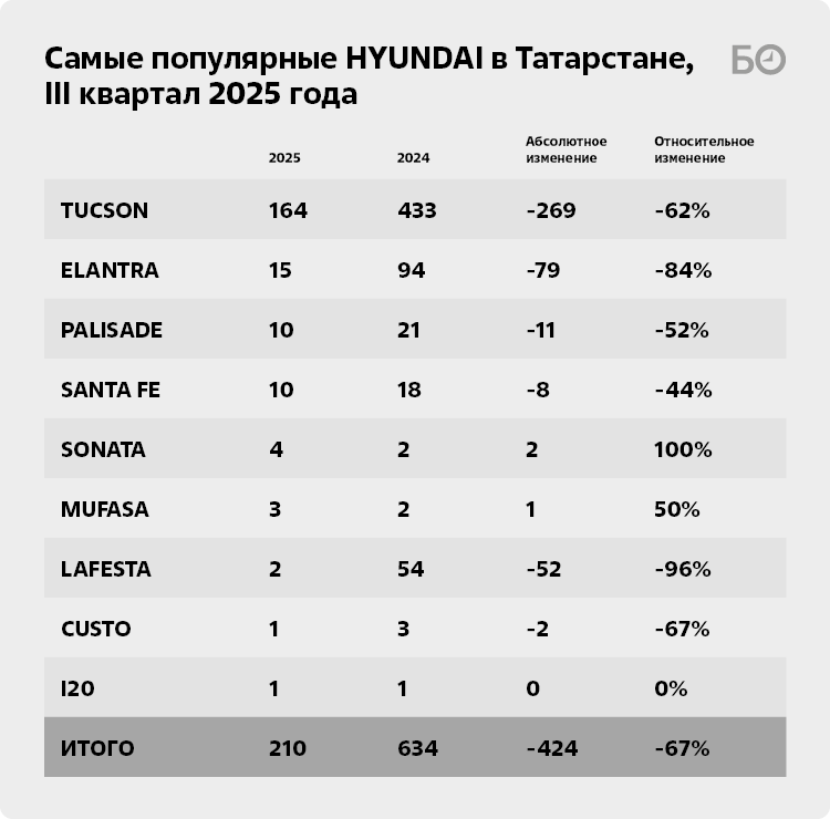На 1-м месте среди моделей Hyundai — кроссовер Tucson. Благодаря своему динамичному и прогрессивному дизайну он «продал» себя в количестве 164 авто против 433 в 2024-м. На 2-м месте разместился седан Elantra, который «уронил» продажи с 94 до 15 авто. На 3-й позиции с 10 продажами — крупноразмерный кроссовер Palisade.