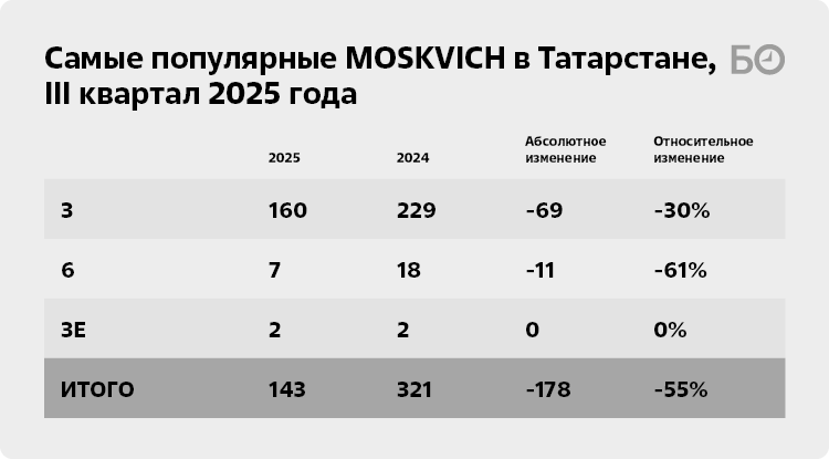 Нельзя не обратить внимание на российский автомобиль, хоть и с китайским прошлым. В III квартале текущего года в республике было реализовано на треть меньше новых машин «Москвич», чем годом ранее. Напомним, «Москвич» — это китайский JAC, который собирают из машинокомплектов на Московском автозаводе, бывшем Renault. За минувший квартал на татарстанском рынке продано 169 таких ТС, тогда как в июле – сентябре 2024-го из автосалонов РТ выехало 249 машин. 160 транспортных средств пришлось на кроссовер с бензиновым двигателем — «Москвич-3», 7 продаж — на «Москвич-6», донором для которого стал китайский автомобиль Sehol A5 Plus. Электрический «Москвич-3е» пока не пользуется популярностью в Татарстане: за прошедший период было продано всего два таких электрокара.