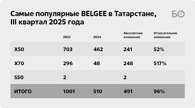 Продукция белорусско-китайского совместного предприятия по сборке легковых автомобилей Geely под маркой Belgee обогнала своего «родителя». Еще год назад завод собирал только одну модель — кроссовер Belgee X50, который является точной копией китайской Geely Coolray. Сейчас же в республику завозят и другие модели, выпускаемые на этом заводе. Например, Belgee X70, который в Китае представлен моделью под именем Geely Atlas Pro, а также Belgee S50, пришедший на замену седана Geely Emgrand. Всего в Татарстане за анализируемый период был реализован 1 001 китайский автомобиль с белорусской «пропиской», что в 2 раза больше, чем в АППГ.