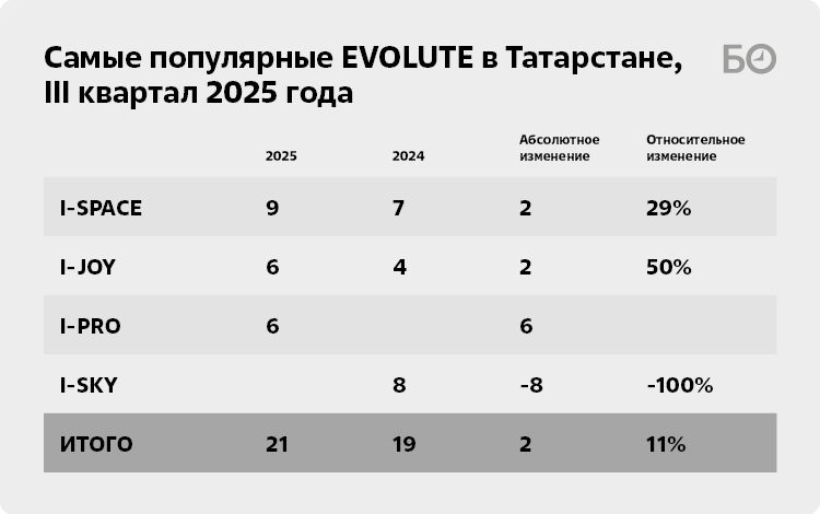 Еще один российский автомобильный бренд — марка Evolute. За прошедший квартал в республике была зарегистрирована 21 машина данной марки — это на два ТС больше, чем годом ранее. На данный момент в линейке Evolute пять авто, четыре из которых полностью электрические (i-Pro, i-Joy, i-Sky и i-Jet), а также один гибридный i-Space. За исследуемый период татарстанские автолюбители выкупили 9 «гибридов» и по 6 i-Pro и i-Joy.
