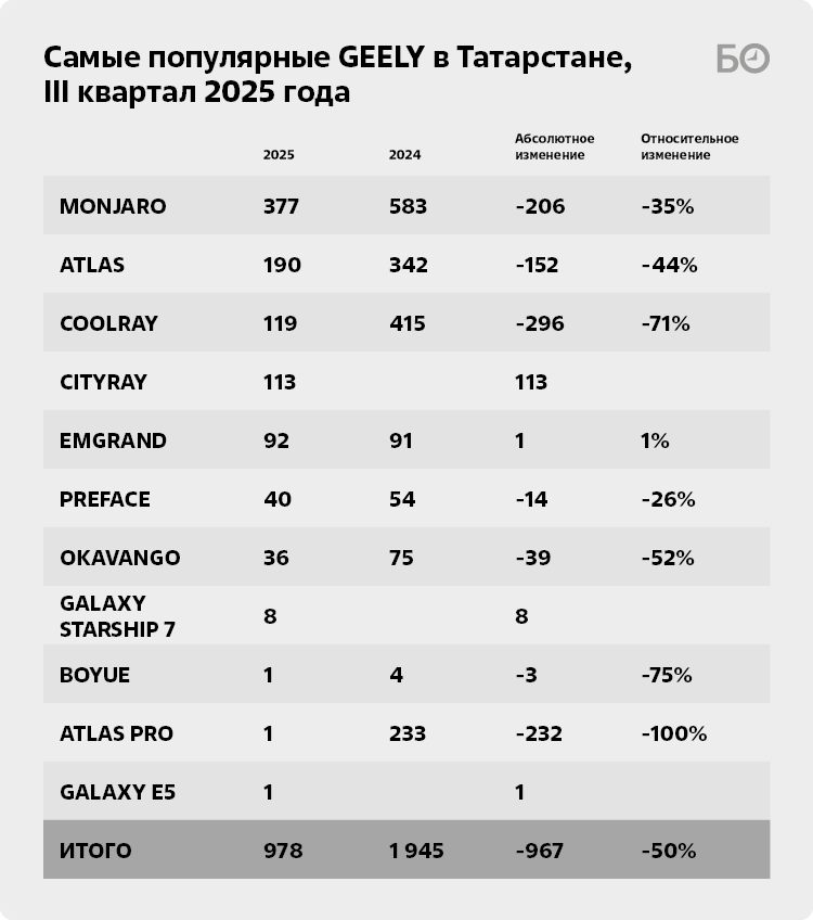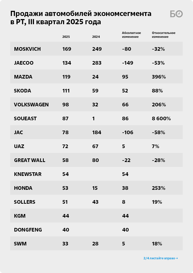 Зато объемы продаж автомобилей китайской марки Geely в РТ в июле – сентябре 2025 года, наоборот, упали в 2 раза по сравнению с таким же периодом 2024-го. За прошедшие три месяца текущего года на татарстанском рынке продано 978 кроссоверов и внедорожников Geely.