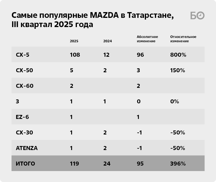 В топ растущих брендов в РТ за длительное время попала японская Mazda, чей республиканский рейтинг вырос в 4 раза до 119 авто. Самой продаваемой моделью марки в Татарстане остается среднеразмерный кроссовер СХ-5, улучшивший свой результат в 9 раз до 108 регистраций. Более крупный и премиальный автомобиль CX-50 разошелся в количестве пяти единиц. На замену Mazda 6 в республику «заехали» две ее китайские замены — Mazda Atenza и Mazda EZ-6. Вторая — это плюс-минус та же модель, только исключительно в электрическом варианте под более привычным обозначением 6 и со скромной, но идеологически правильной припиской «е».