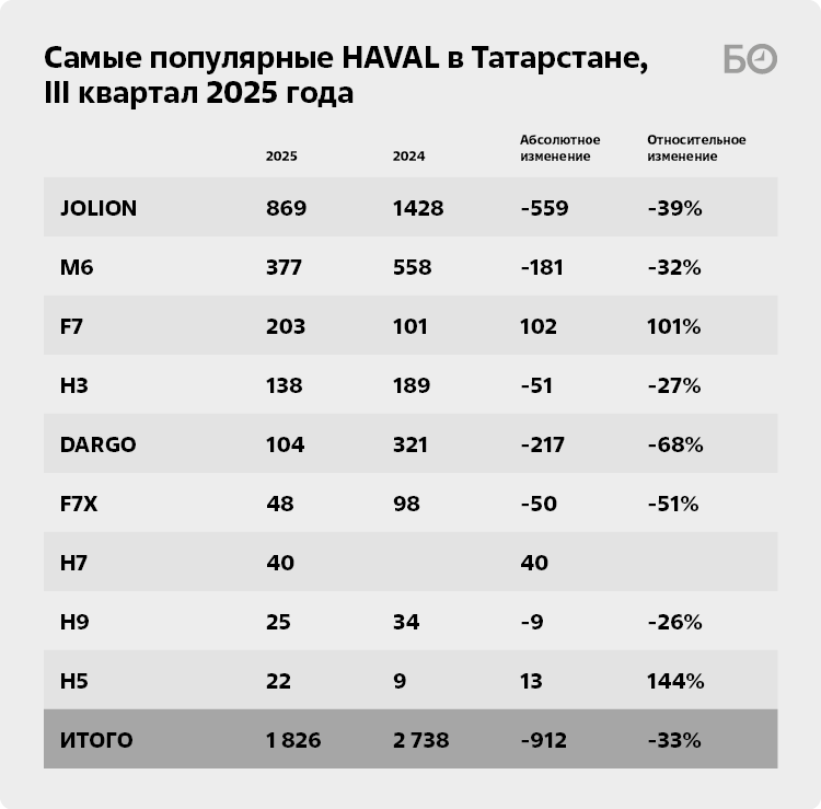 На 2-м месте по количеству зарегистрированных в РТ новых автомобилей расположилась китайская марка Haval — внедорожное подразделение Great Wall Motors. Благодаря тому что Haval собирают на заводе в Туле, только 6% автомобилей этого бренда, реализованных в прошлом квартале, было собрано в Китае. Объем реализации упал на треть — с 2 738 до 1 826 транспортных средств. Доля бренда на республиканском рынке снизилась с 13,8 до 10,7%.