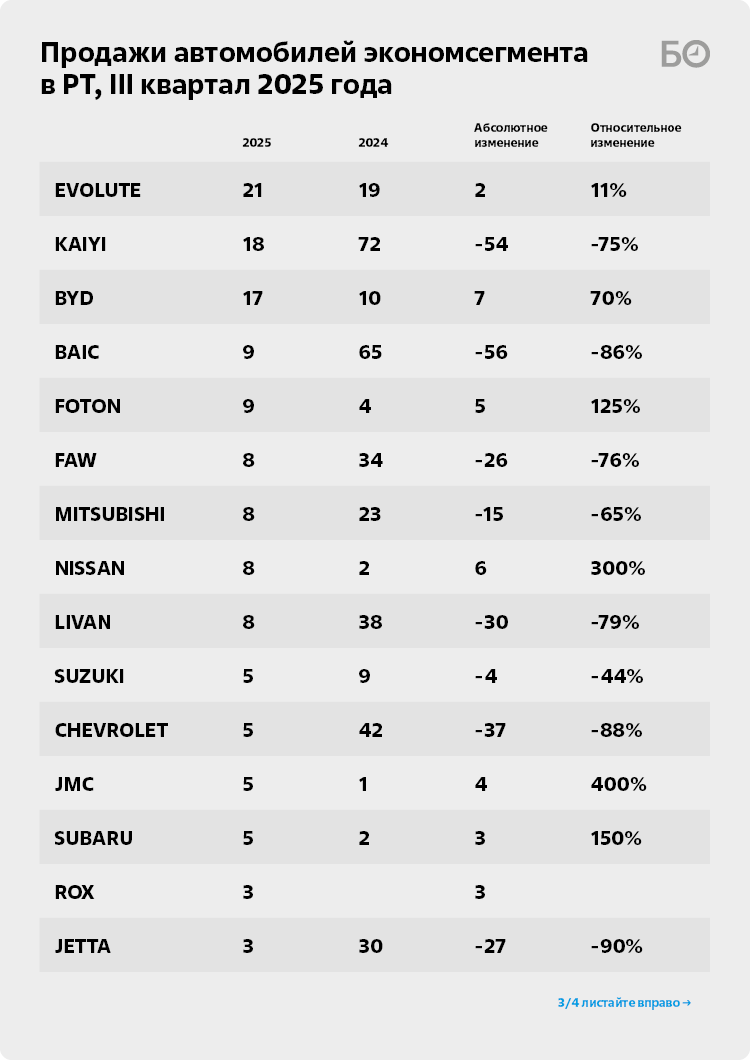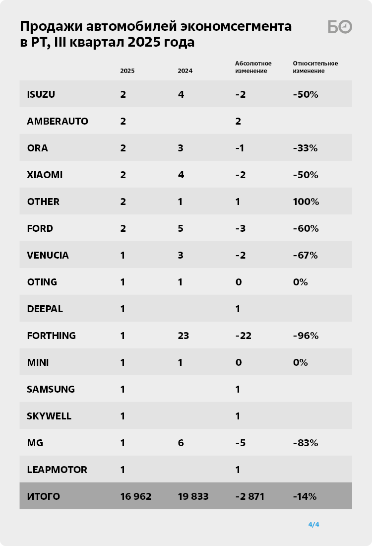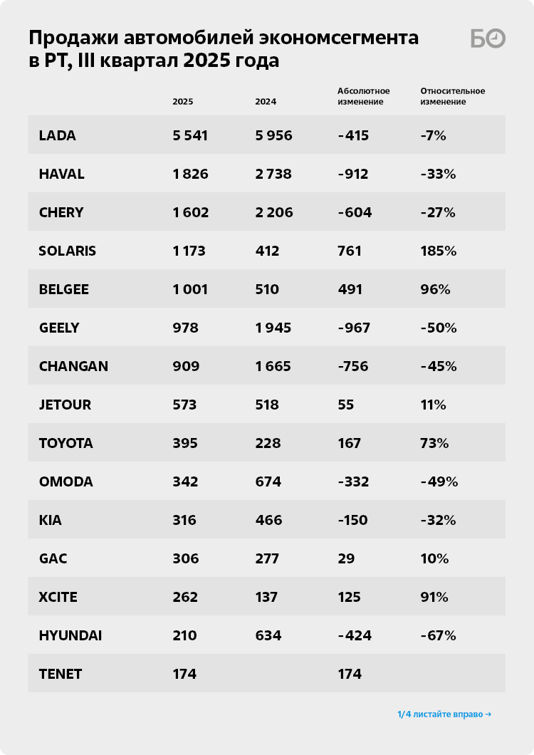 Что касается транспортных средств экономсегмента, то картина следующая: в III квартале 2025-го в республике было зарегистрировано почти 17 тыс. новых авто, тогда как в аналогичном периоде прошлого года — почти 19,9 тысячи. Несмотря на падение продаж по сравнению с 2024-м, прошедший квартал, если не брать опять-таки аналогичный период прошлого года (АППГ), был самым продуктивным за последние 9 лет. Если брать период до начала СВО, то максимальные продажи наблюдались в 2017-м. Тогда за аналогичные три месяца было поставлено на учет 14,8 тыс. новеньких авто.