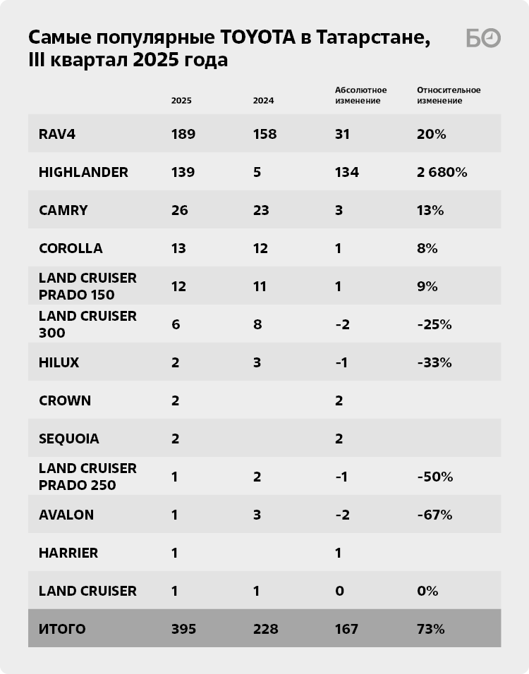 Любимец публики — среднеразмерный кроссовер Rav4 — прибавил 20%, что в итоге вылилось в 189 регистраций. Второй самой популярной моделью ушедшего бренда стала Toyota Highlander, продажи которой выросли в 27 раз — с 5 до 139 авто. Спрос на бизнес-седан Camry остался практически на уровне прошлого года — 26 зарегистрированных новеньких ТС. Помимо «классических» моделей, в Татарстане встали на учет две Sequoia — рамный внедорожник с V-образным 6-цилиндровым мотором объемом 3,5 литра. Разница у них только одна: у одной модели мощность мотора составляет 394 л. с., у другой — 436 л. с. Обе машины оформлены на компании.