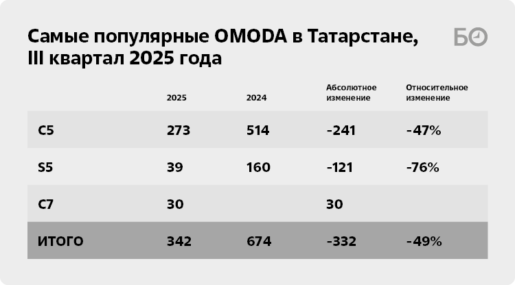 По количеству проданных новых авто группы на 3-м месте идет марка Omoda. В иерархической лестнице ее можно поставить между Chery и Exeed, потому что модели сделаны с уклоном на премиальность. Сейчас в продаже доступен кроссовер С5 и среднеразмерный седан S5, а также на рынок вышла новинка — крупный кроссовер C7. Первого было продано 273 единицы, второго — 39, третьего — 30 авто. Итого всего 342 машины, что почти в 2 раза меньше показателей 2024-го.