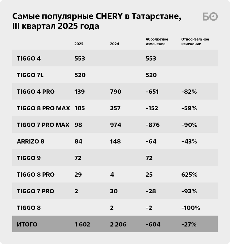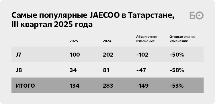 За прошлый квартал в республике продано 134 автомобиля бренда Jaecoo, также принадлежащего Chery. В целом бренд Jaecoo представлен стильным кроссовером J7, который сочетает в себе целый набор технологий и внедорожных возможностей, а также кроссовером J8, который стал основным конкурентом Geely Monjaro. При этом внешность J8 повторяет уже вышедшую на рынок Китая Chery Tiggo 9. Единственное значимое отличие — решетка радиатора с тонкими хромированными ламелями. Всего же по дорогам Татарстана разъехалось 100 «семерок» и 34 «восьмерки».