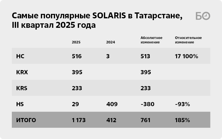 В Татарстане за прошедший квартал было продано 1 173 таких автомобиля, что почти в 3 раза больше, чем в 2024-м. Это 516 Solaris HS, 395 Solaris KRX, 233 Solaris KRS и 29 Solaris HC. Сами машины не изменились, за исключением логотипа. В связи с тем, что компания Hyundai официально ушла из России, продав свой завод фирме «Арт-Финанс», прав на товарный знак у последней нет, что и привело к своего рода ребрендингу.