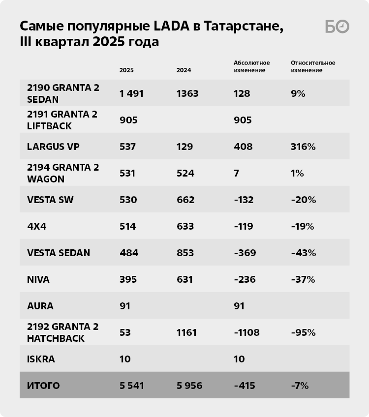 Что касается классических моделей, то здесь без изменений. Самой популярной моделью на рынке Татарстана остается LADA Granta в четырех вариантах: седан, хетчбэк, универсал и лифтбек. Суммарный объем продаж автомобилей данной модели составил 2 980 единиц, показав снижение по сравнению с 2024-м на 2%, или на 68 машин. Несмотря на это, доля продаж Granta в РТ внутри модельного ряда АвтоВАЗа повысилась с 51 до 54%, а доля общей реализации ТС — с 15,3 до 17,6%.