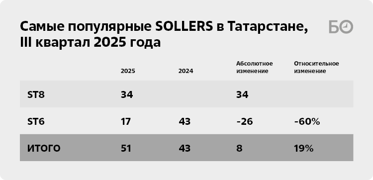 Отдельно выделим группу «Соллерс», которая выпускает автомобили «УАЗ» и Sollers. Если по итогам III квартала 2024 года в РТ было реализовано 67 машин «УАЗ», то в 2025-м — уже 72. Основной прирост дала модель 3163 Patriot — автомобиль повышенной проходимости для эксплуатации на дорогах всех категорий, а также по пересеченной местности. Рыбаками и охотниками Татарстана было приобретено 57 против 36 таких транспортных средств в прошлом году. Еще 14 продаж пришлось на пикап на базе Patriot, а одна — на модель Hunter.