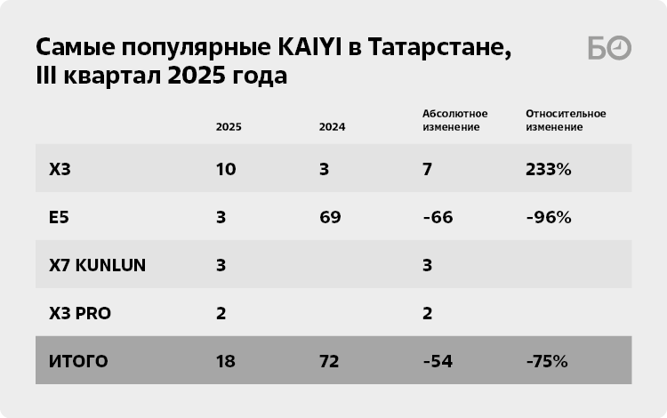 Следующий суббренд Chery — Kaiyi, известный тем, что собирается на российском заводе «Автотор» в Калининграде. В Татарстане марка представлена седаном E5, который является обновленной версией Chery Arizzo 7, а по своим габаритам это конкурент Hyundai Elantra. Также есть спрос на компактный кроссовер Х3 и его более богатую версию Х3 Pro, а также на среднеразмерный кроссовер Kunlun. В целом за год продажи по данной марке упали в 4 раза — с 72 до 18.