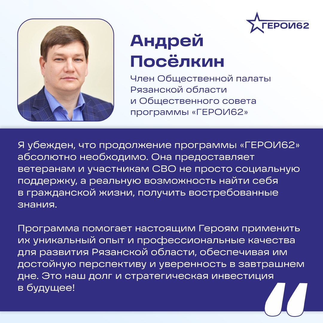 Продолжение кадровой программы «ГЕРОИ62» — необходимо. В этом убеждён член Общественной палаты региона и Общественного совета проекта Андрей Посёлкин.