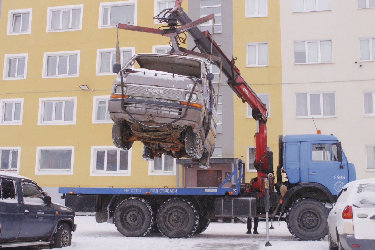 #НОРИЛЬСК. «Таймырский телеграф» – Вывоз неиспользуемых авто проводится в Норильске регулярно по обращениям жителей и управляющих организаций. Вчера от очередного автохлама очистили двор дома №7 на улице Мира.