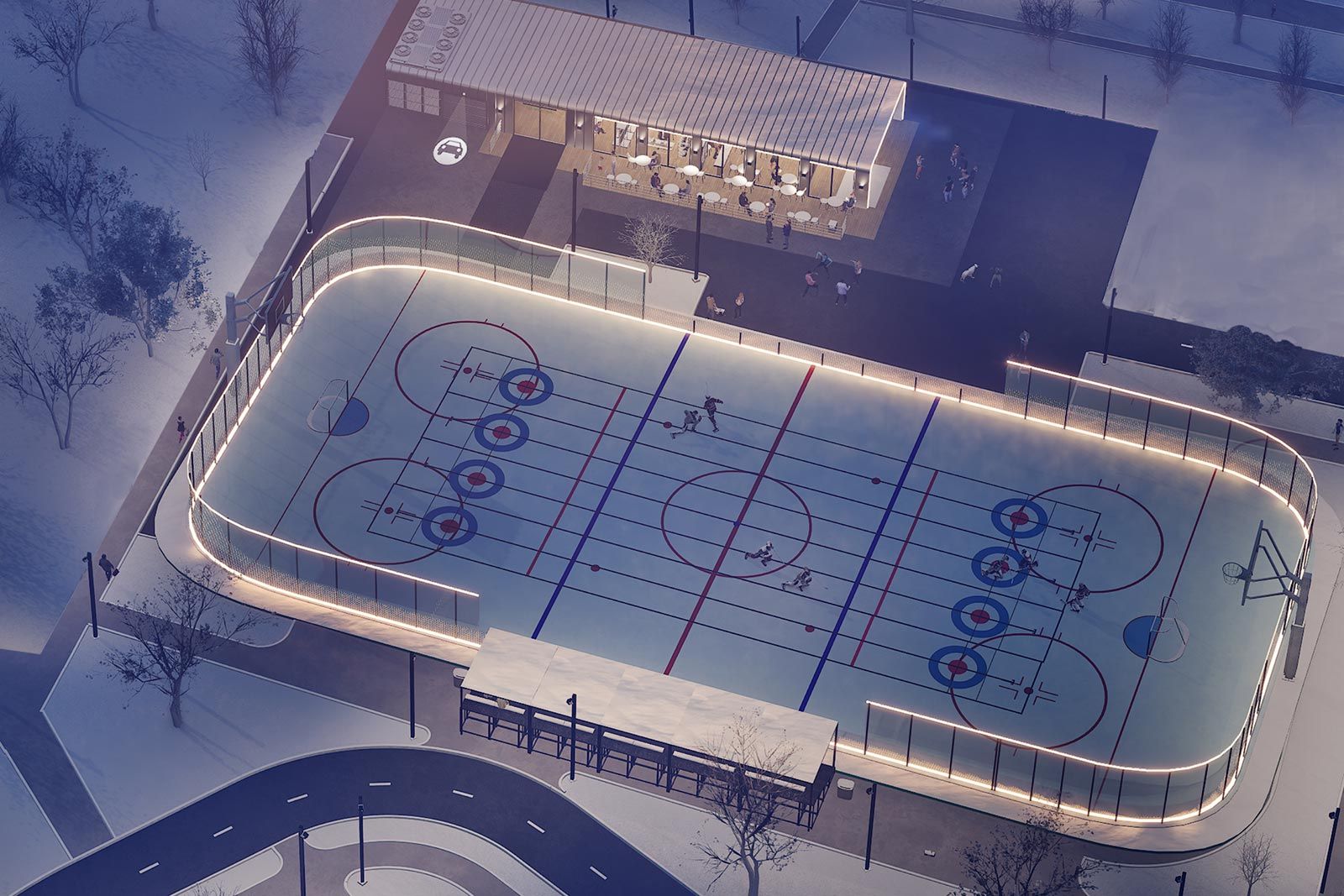 Возле каждой площадки появится многофункциональный павильон с раздевалками, кафе, медицинским постом и гаражом для ледозаливочной техники.