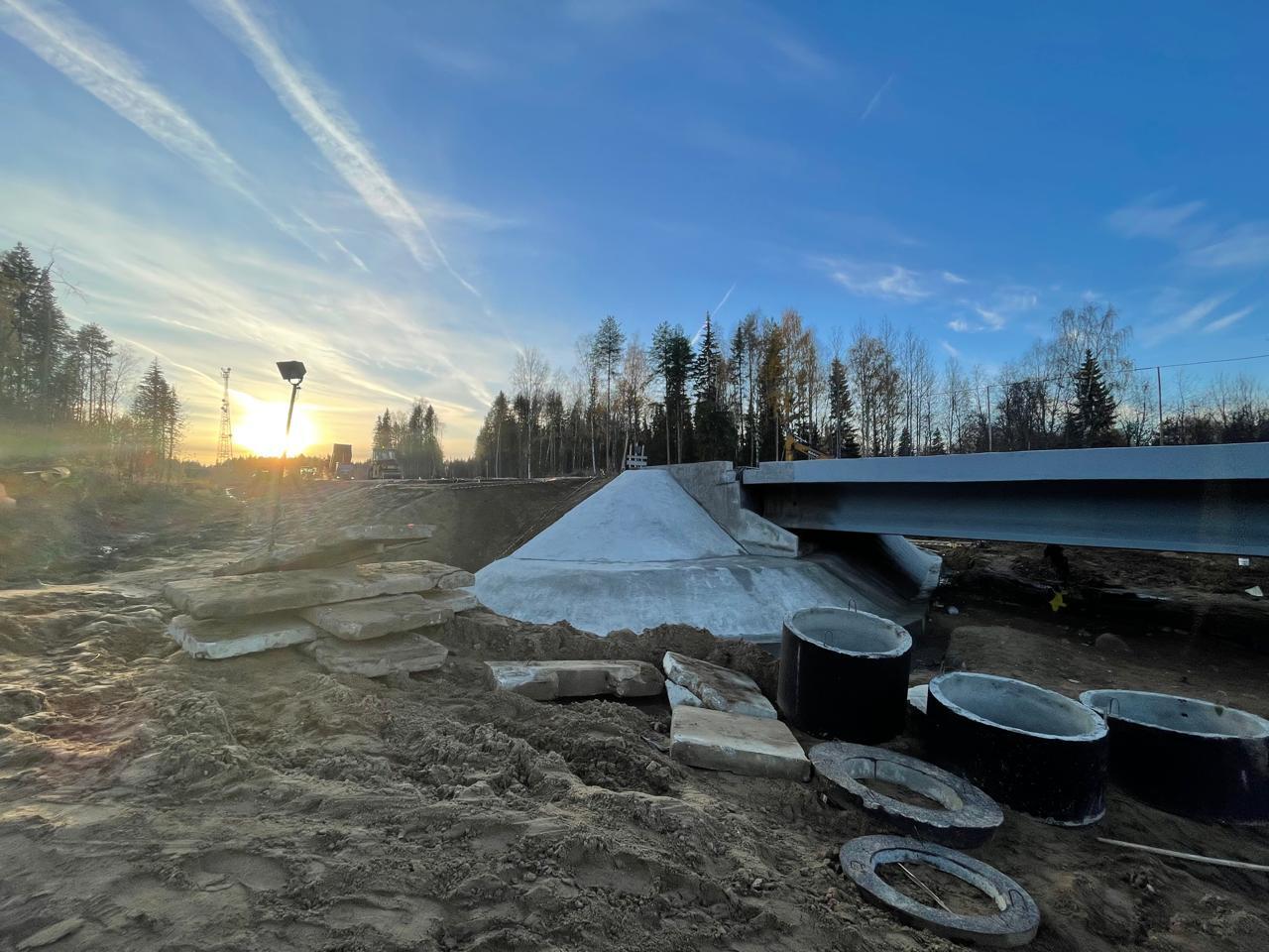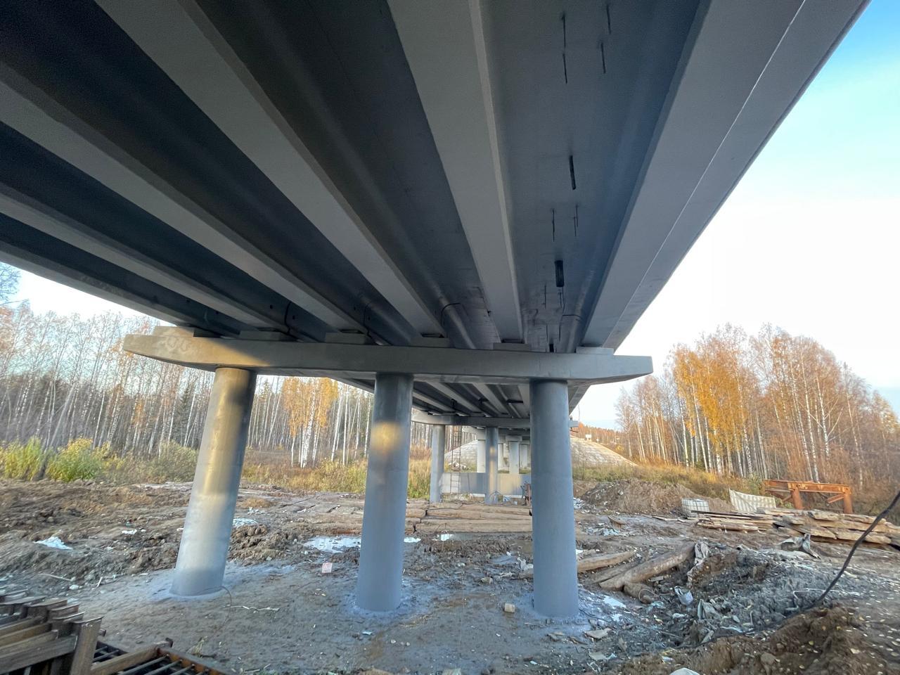 Уже выполнен ряд работ на объекте, включая армирование и бетонирование защитного слоя пролетов (тротуарный участок), покраску пролетов, укладку геосетки и устройство щебеночного основания. На текущем этапе выполняются работы по разработке кабеля ПАО «Ростелеком» между колодцами дренажа, разработке котлована дренажа, монтажу колодцев дренажа и труб в щебеночной обойме, обратной засыпке, укладке рубероида, устройству основания из щебня на обочинах, укладке асфальтобетонной смеси на подходах, розливу вяжущих материалов по бетонной поверхности моста, укладке нижнего слоя покрытия из асфальтобетона на мосту.
