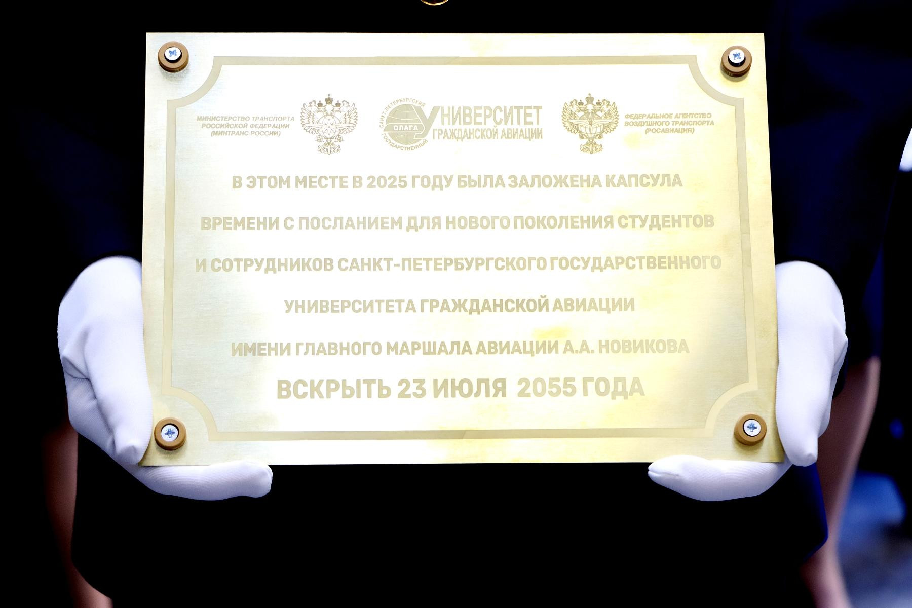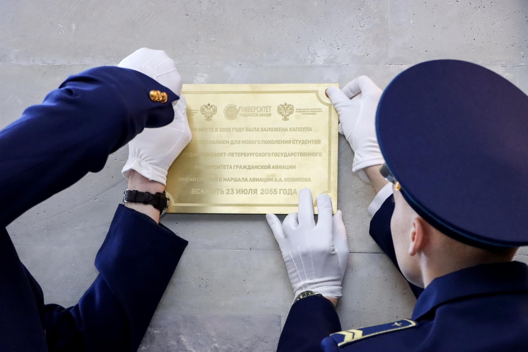 В холле главного корпуса университета состоялась церемония закладки капсулы времени с посланием потомкам, в котором отражены ключевые ценности СПбГУ ГА – преданность профессии, любовь к небу, взаимовыручка и поддержка, стремление к знаниям. Капсула, которая будет открыта в 2055 году, помещена у бюста Главного маршала авиации Александра Александровича Новикова, имя которого носит вуз. На месте установки закреплена памятная табличка.