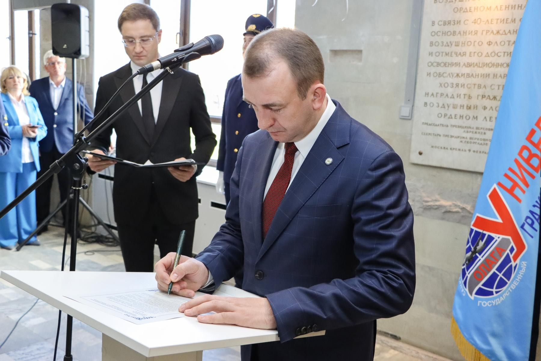 На торжественном собрании с коллективом вуза Владимир Потешкин подчеркнул, что СПбГУ ГА является одним из важнейших центров подготовки высококвалифицированных кадров для всей авиационной отрасли страны. «Сегодня учебное заведение продолжает традиции подготовки высококвалифицированных кадров, которые успешно трудятся в различных регионах России и за её пределами.Благодаря вашему труду наша страна сохраняет лидирующие позиции в области подготовки авиационных специалистов мирового уровня. Особое внимание уделяется развитию научных исследований и инноваций в стенах университета. Современные технологии и передовые разработки играют ключевую роль в обеспечении безопасности полётов и повышении эффективности авиаперевозок», – сказал замминистра транспорта.