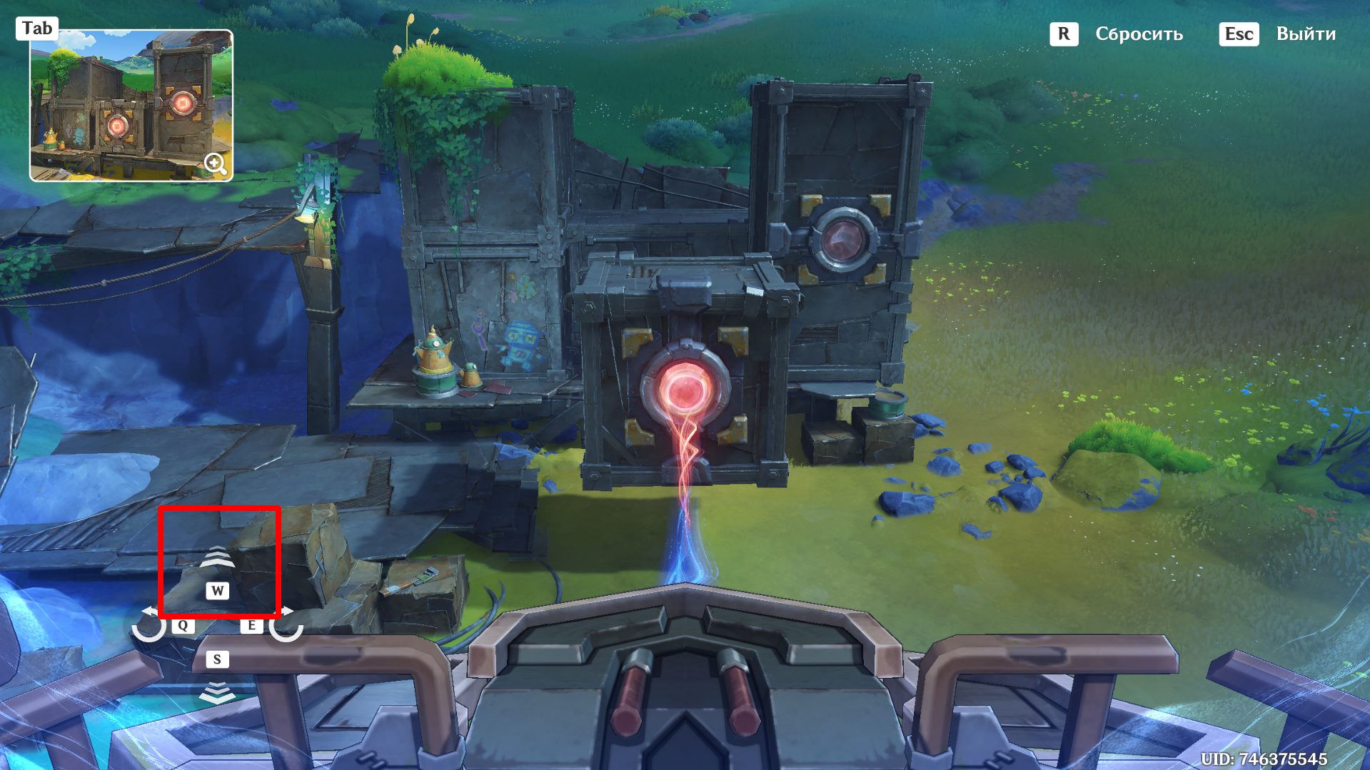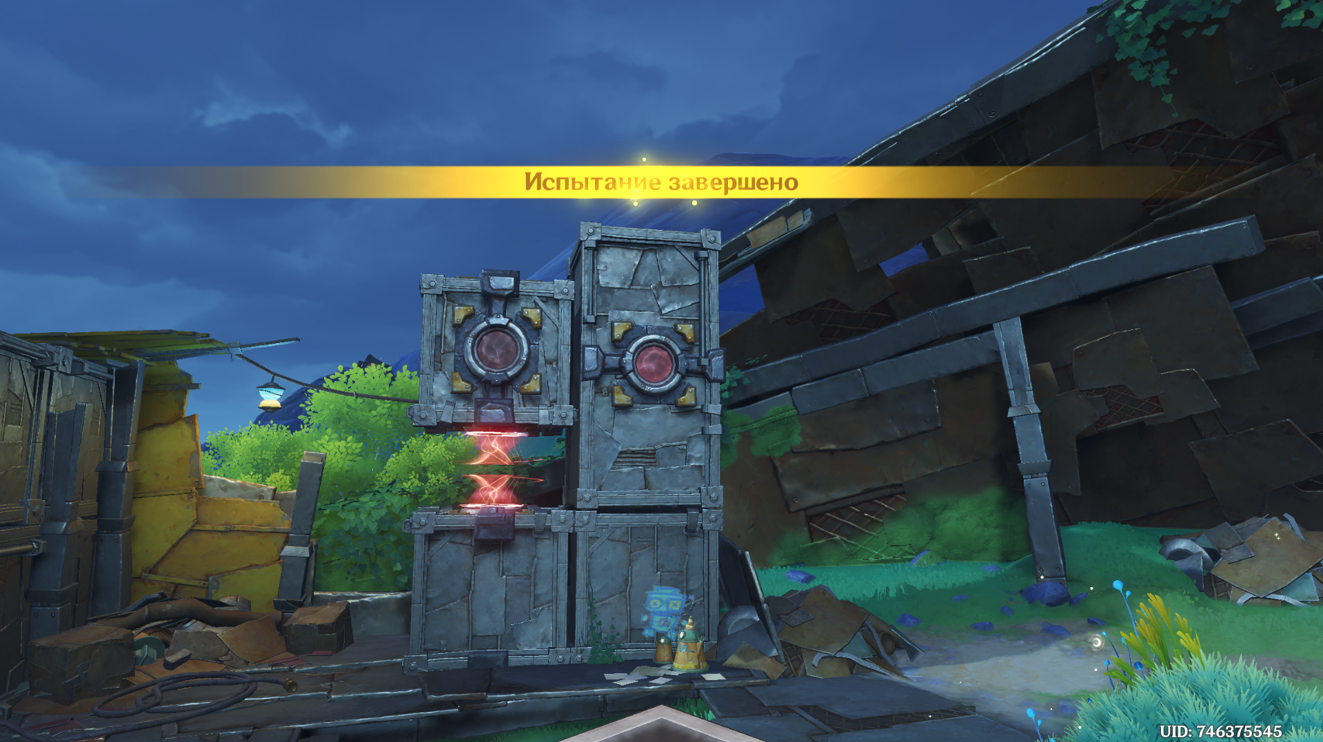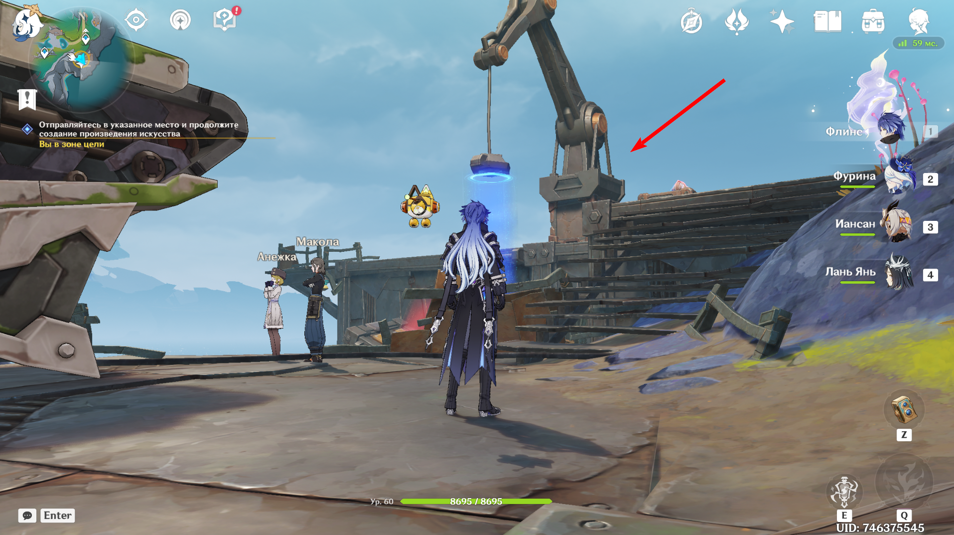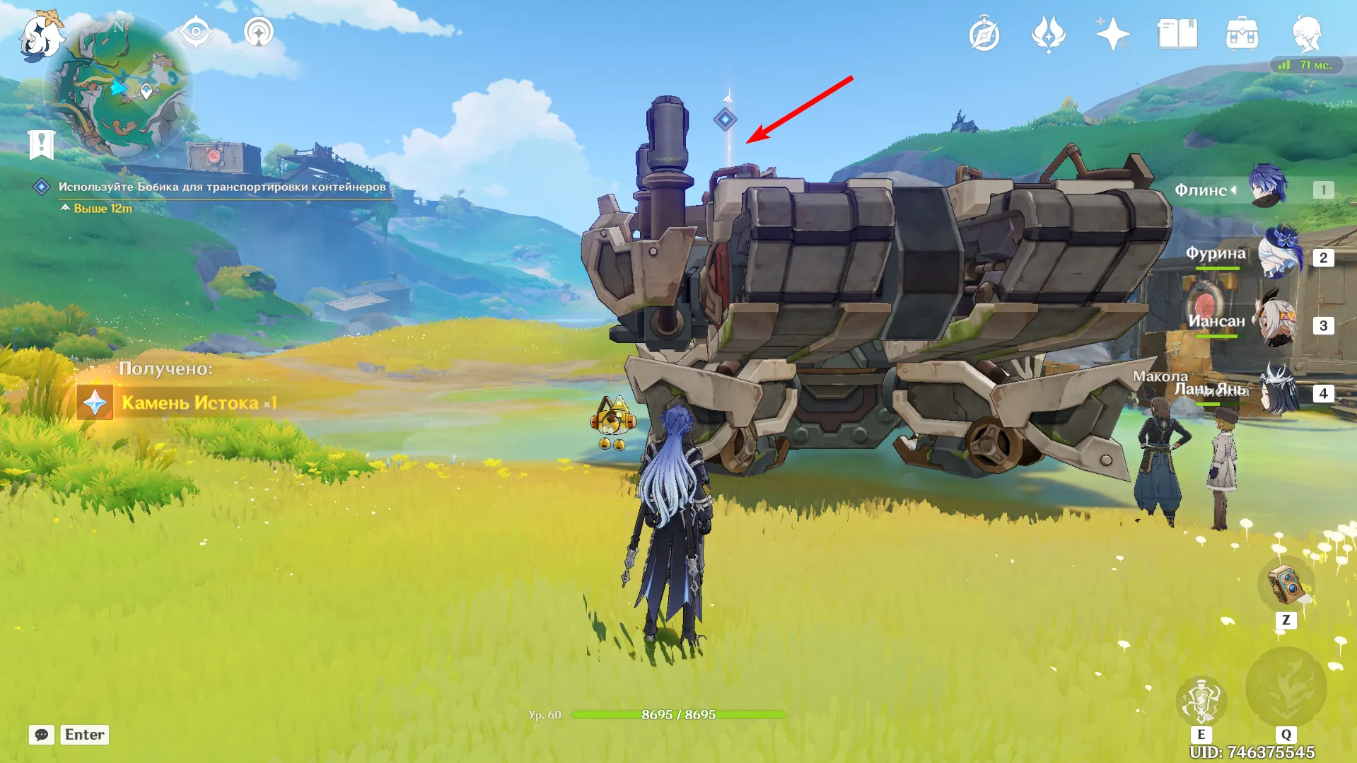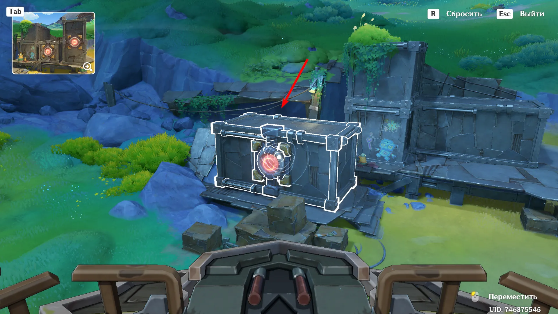 Отвоевав Бобика у Фатуи, вернитесь к созданию арт-объектов из контейнеров. Новое место находится чуть ниже восточного телепорта в Мшистых пустошах. Дождитесь Анежку и Маколу и заберитесь на крейсер. При попытке активировать устройство Паймон скажет, что один из ящиков упал: его нужно подтянуть краном.