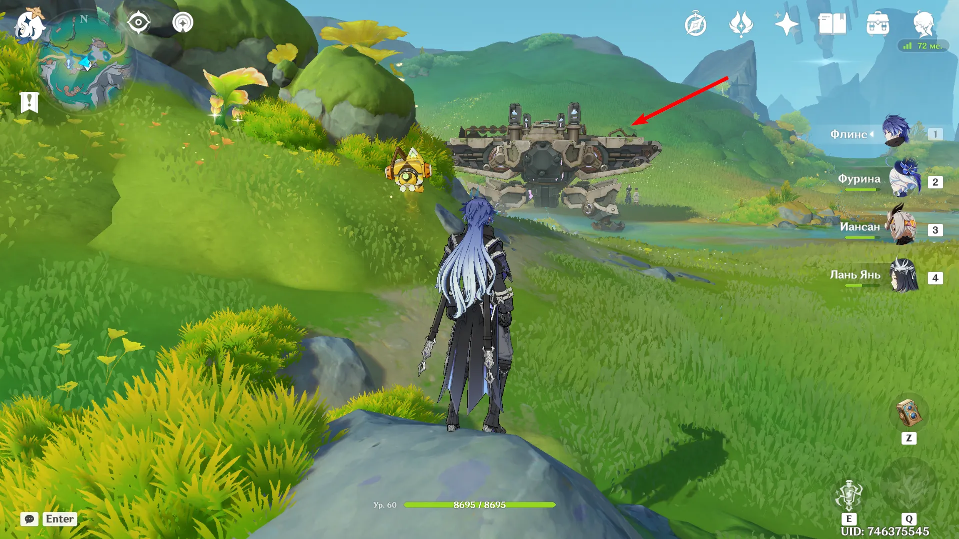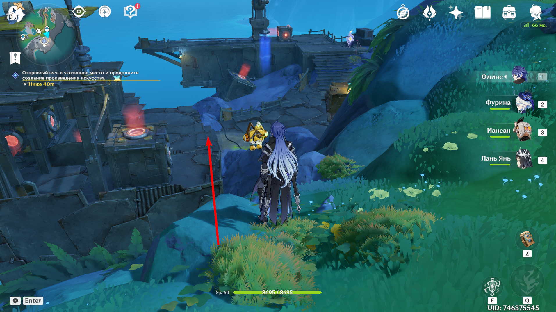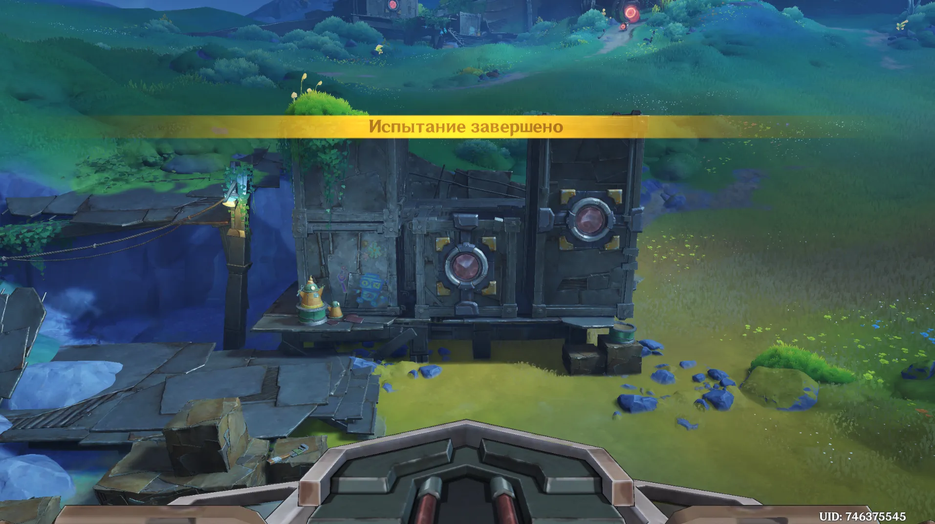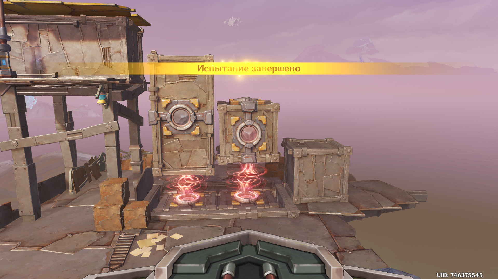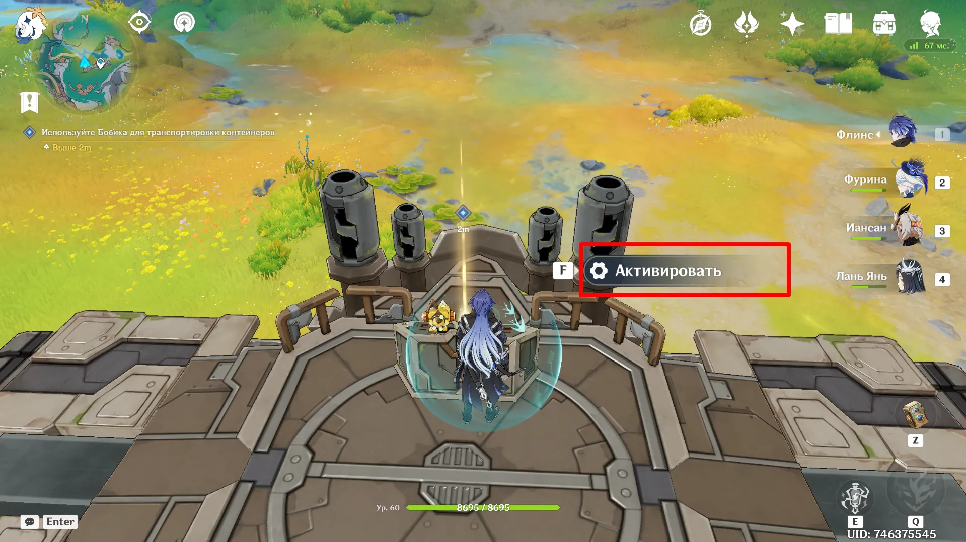 Отвоевав Бобика у Фатуи, вернитесь к созданию арт-объектов из контейнеров. Новое место находится чуть ниже восточного телепорта в Мшистых пустошах. Дождитесь Анежку и Маколу и заберитесь на крейсер. При попытке активировать устройство Паймон скажет, что один из ящиков упал: его нужно подтянуть краном.