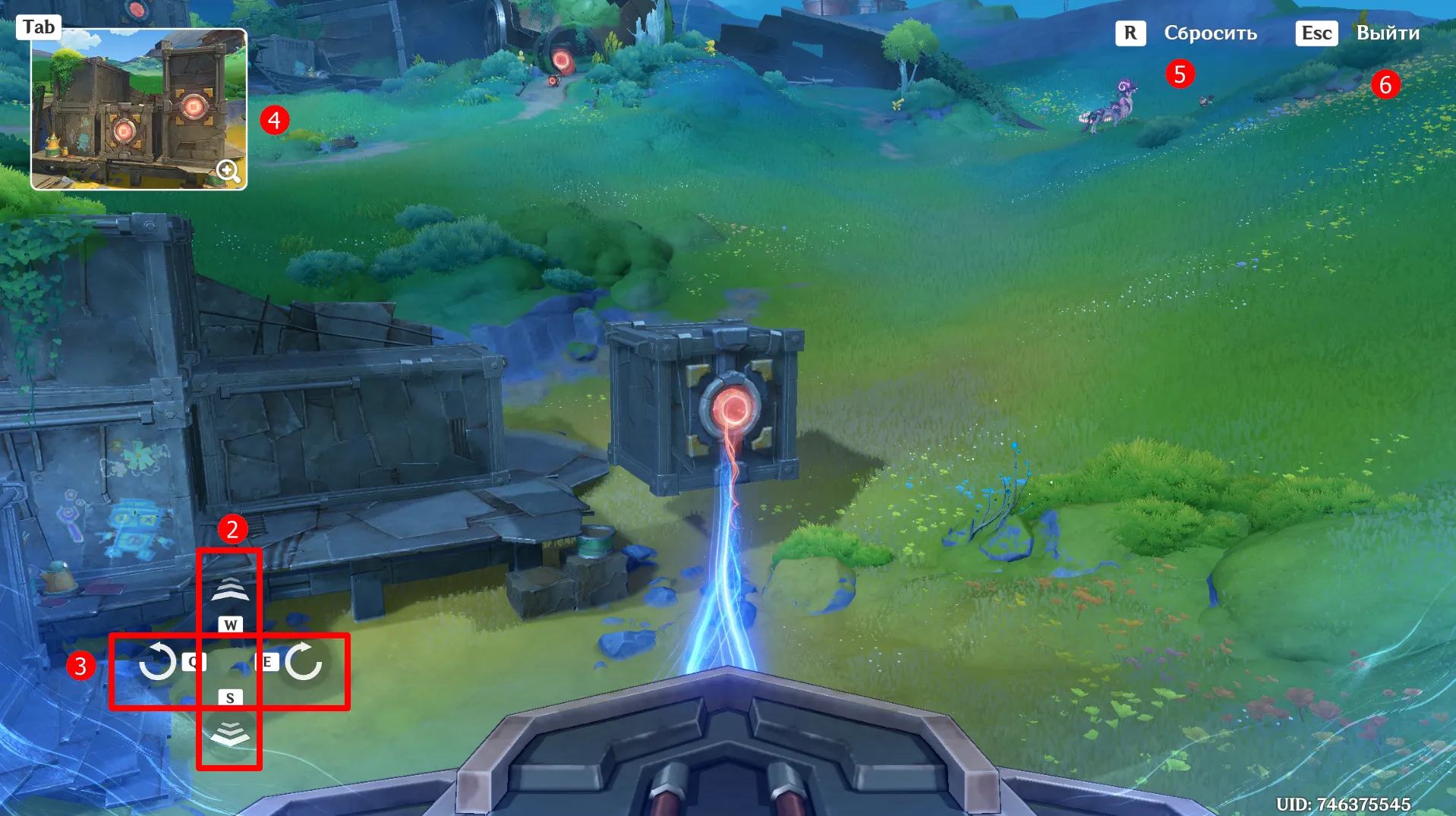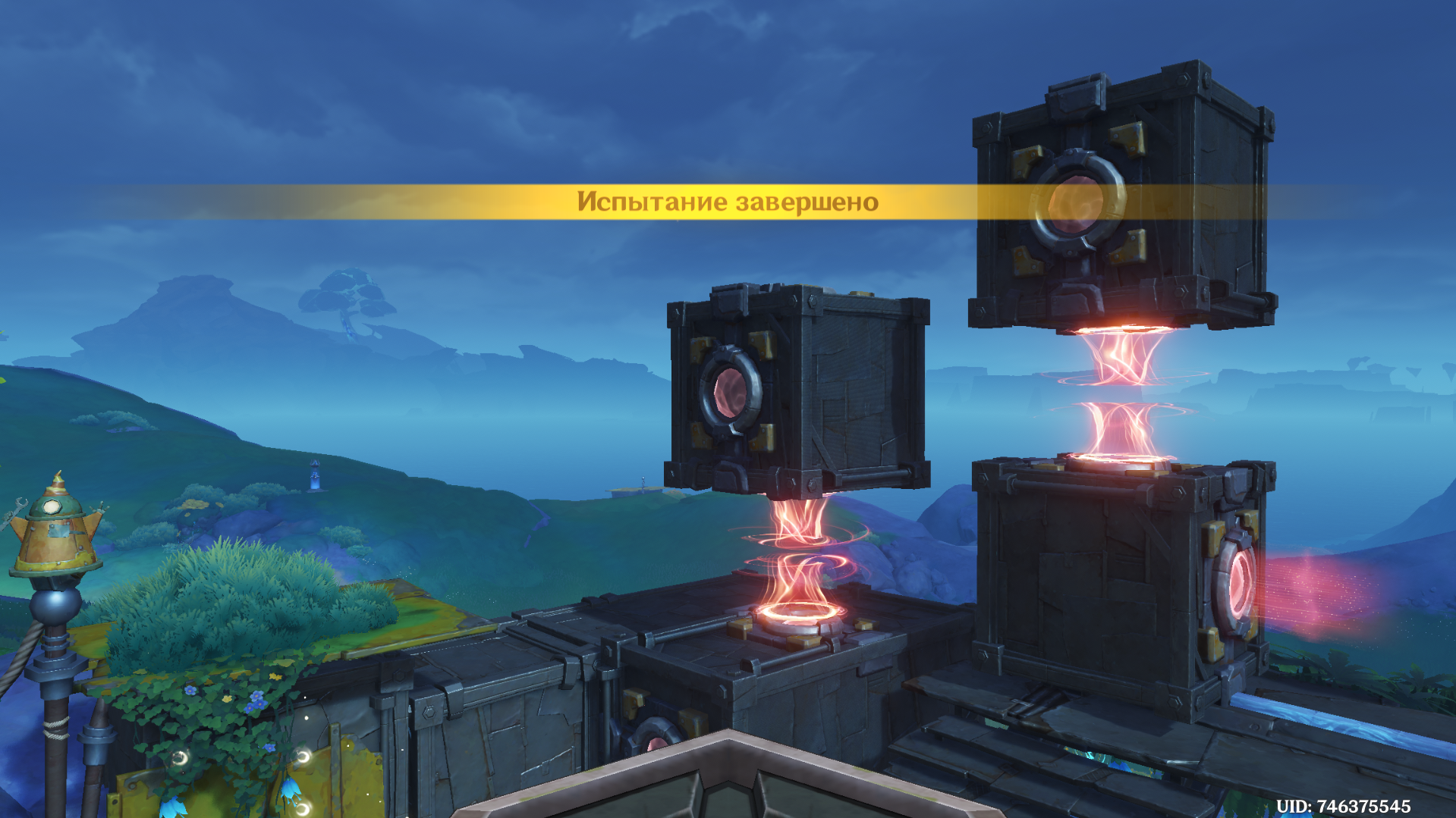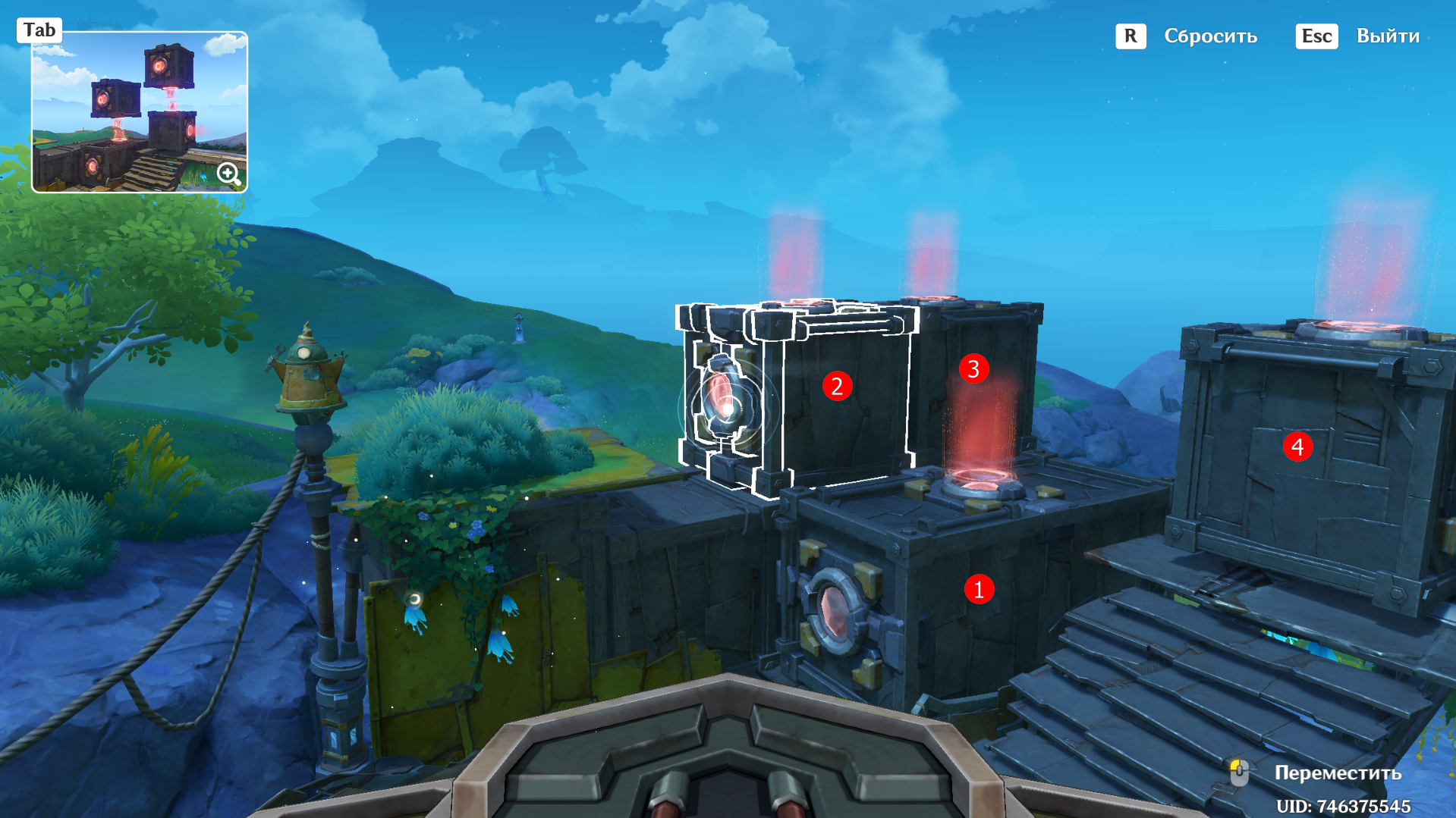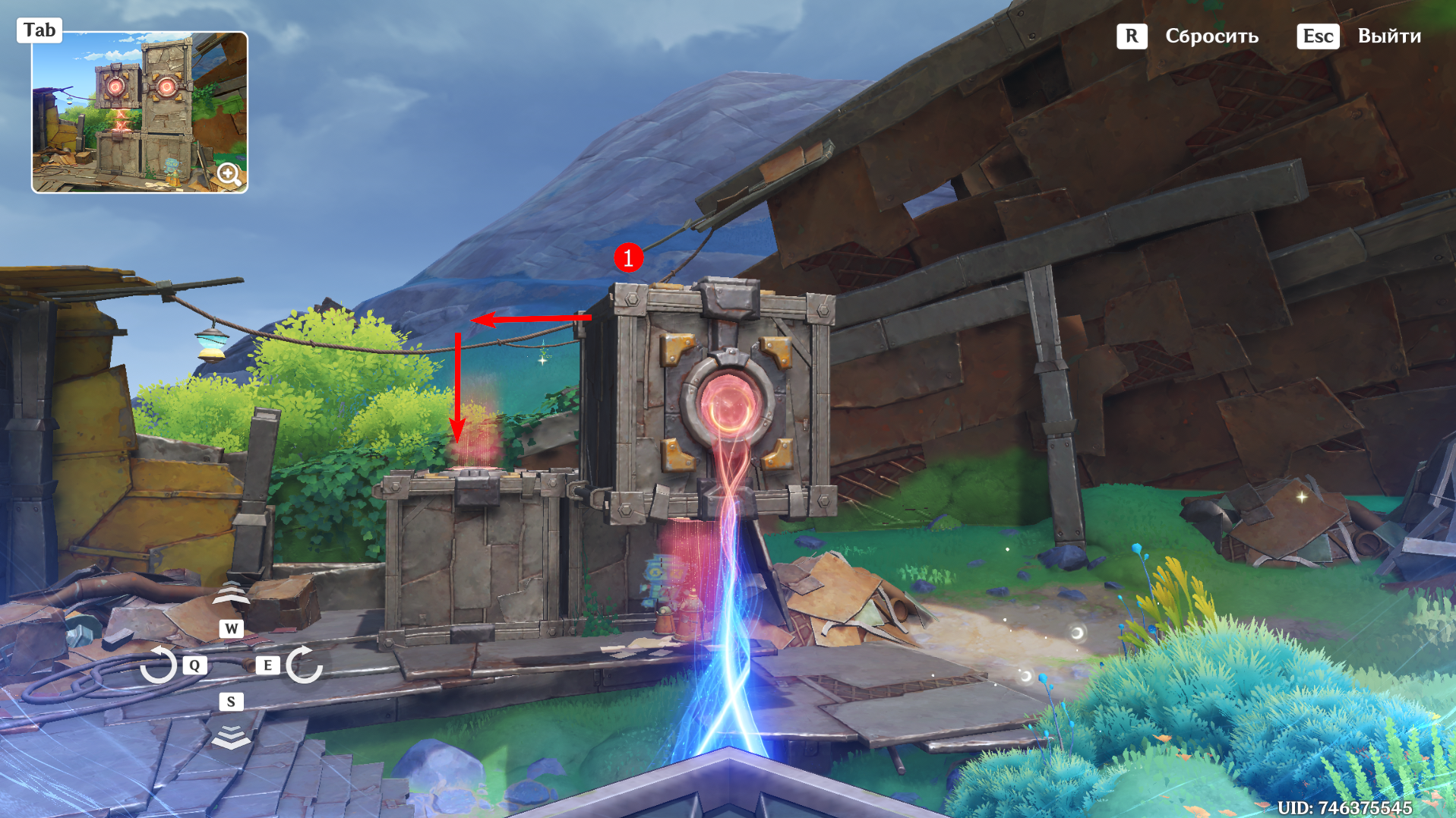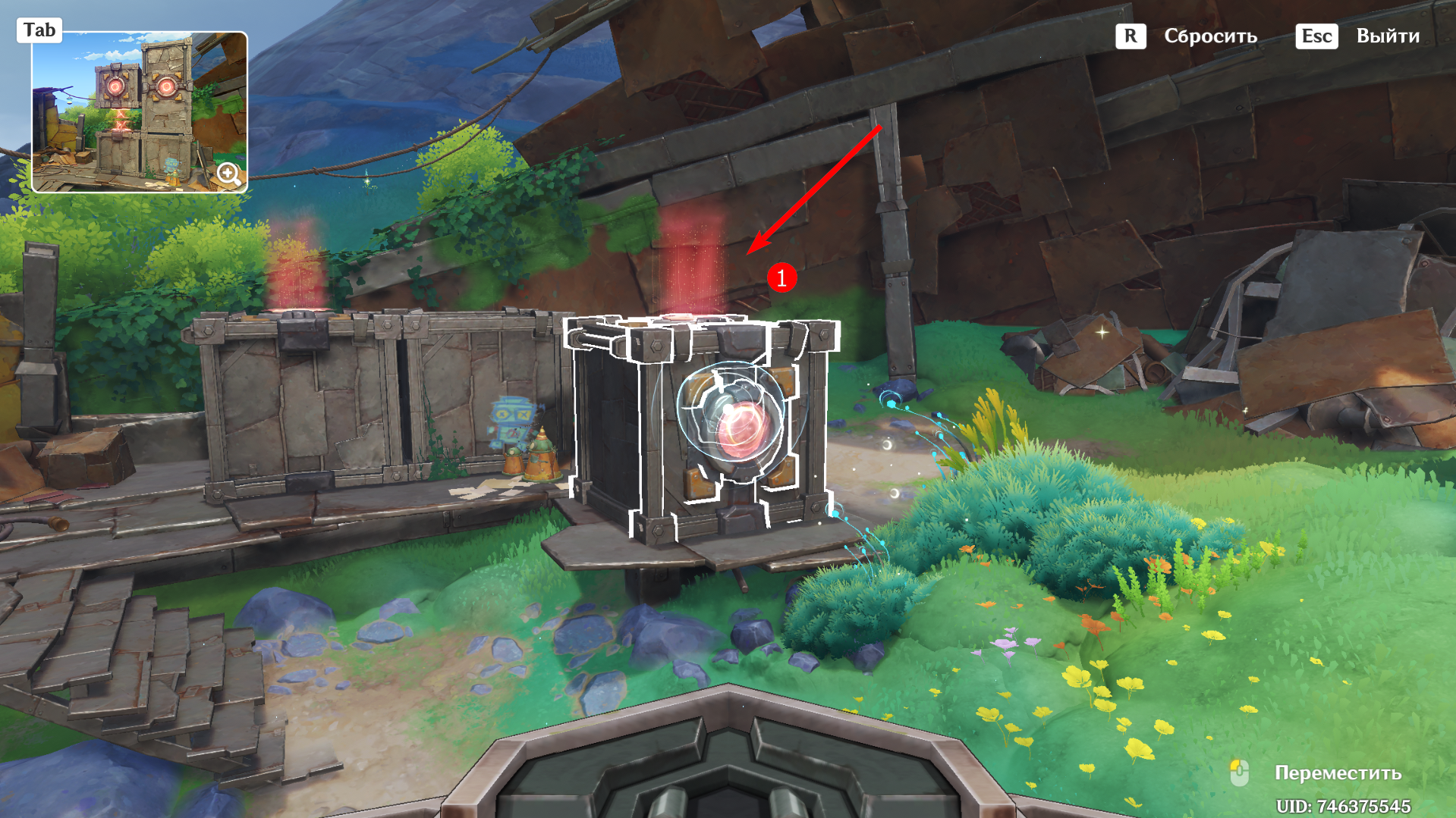 От предыдущего места пройдите на запад, сразитесь с ожидающими Фатуи и заберите богатый сундук. Вновь дождитесь уже знакомую троицу, после чего можете приступать к загадке. Прежде чем активировать Бобика, верните контейнер в правильное место с помощью робота-визуализатора. Толкните куб по рельсу ближе к лестнице и можете приступать к решению головоломки: