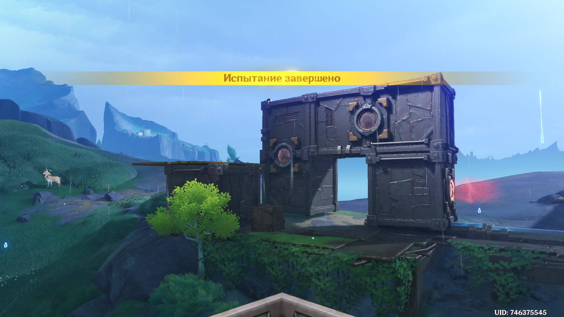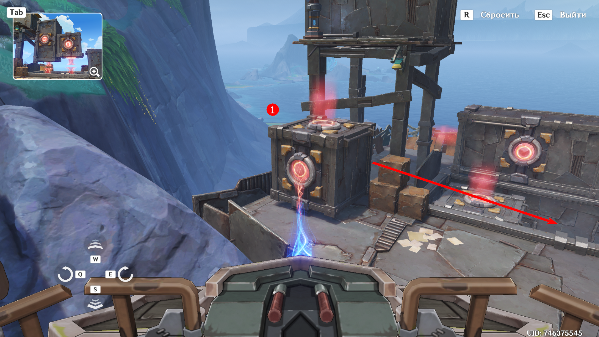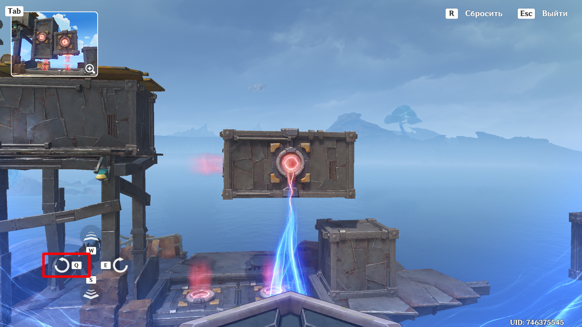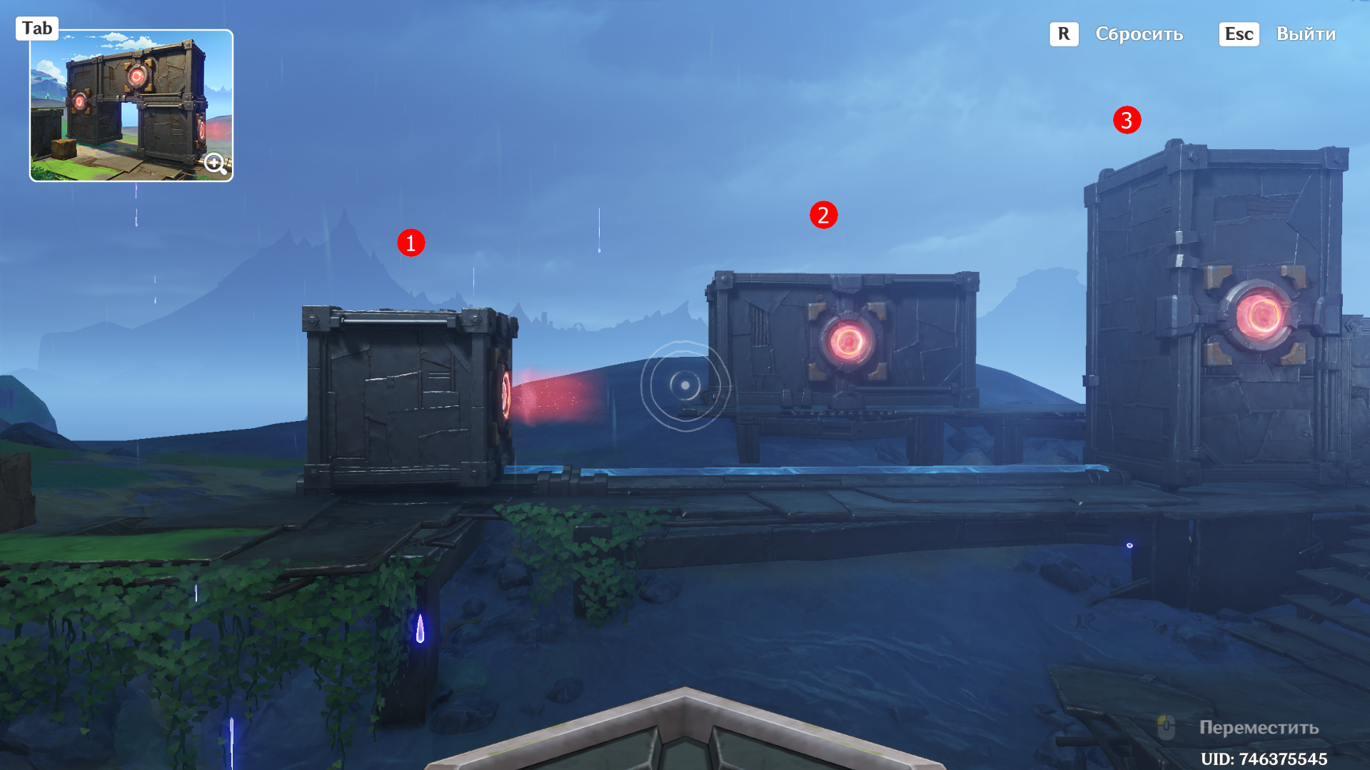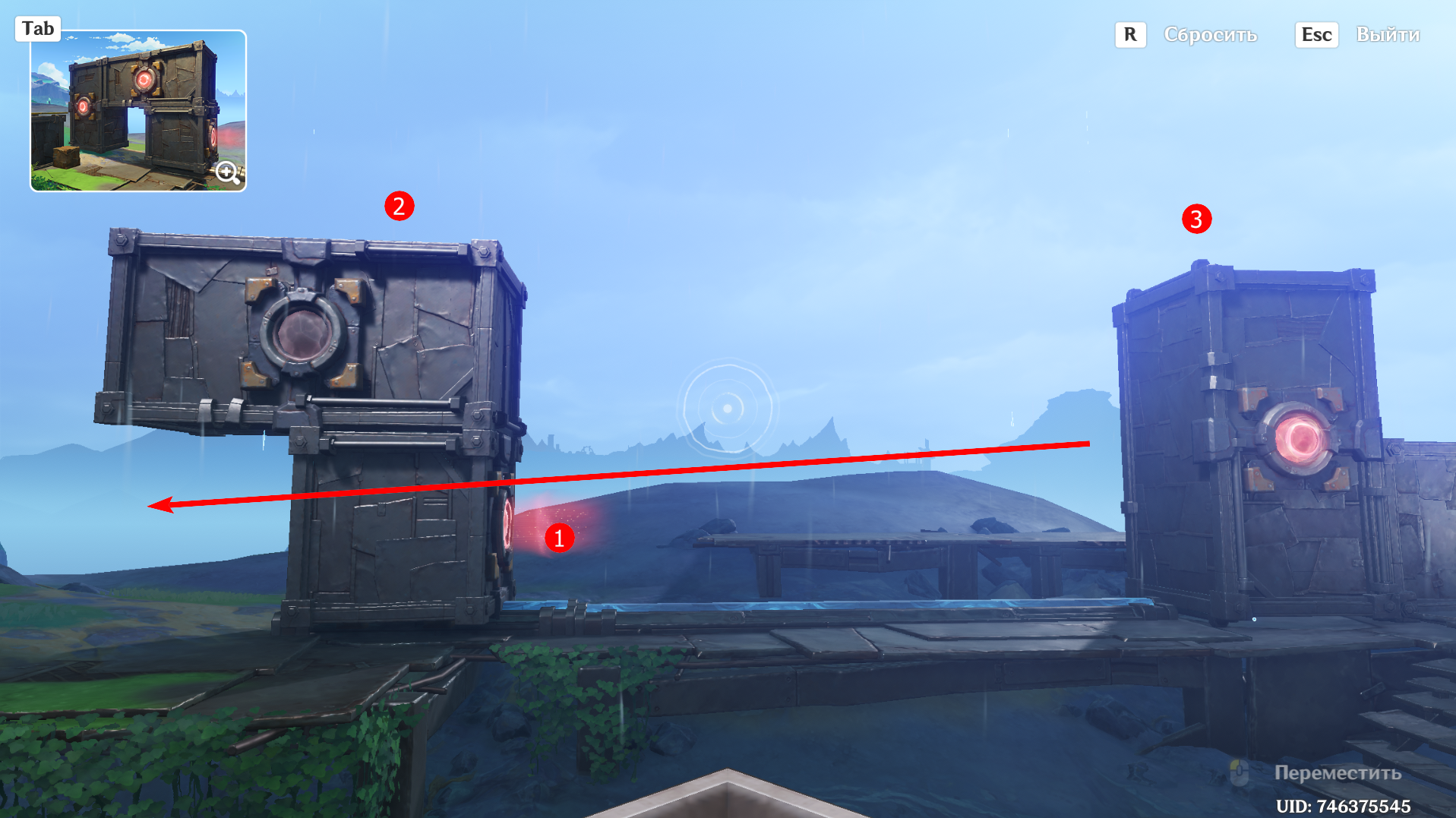 От предыдущего места пройдите на запад, сразитесь с ожидающими Фатуи и заберите богатый сундук. Вновь дождитесь уже знакомую троицу, после чего можете приступать к загадке. Прежде чем активировать Бобика, верните контейнер в правильное место с помощью робота-визуализатора. Толкните куб по рельсу ближе к лестнице и можете приступать к решению головоломки:
