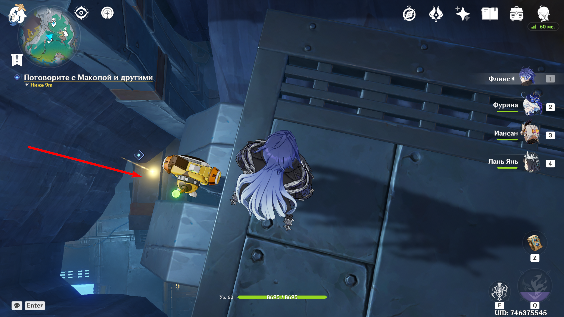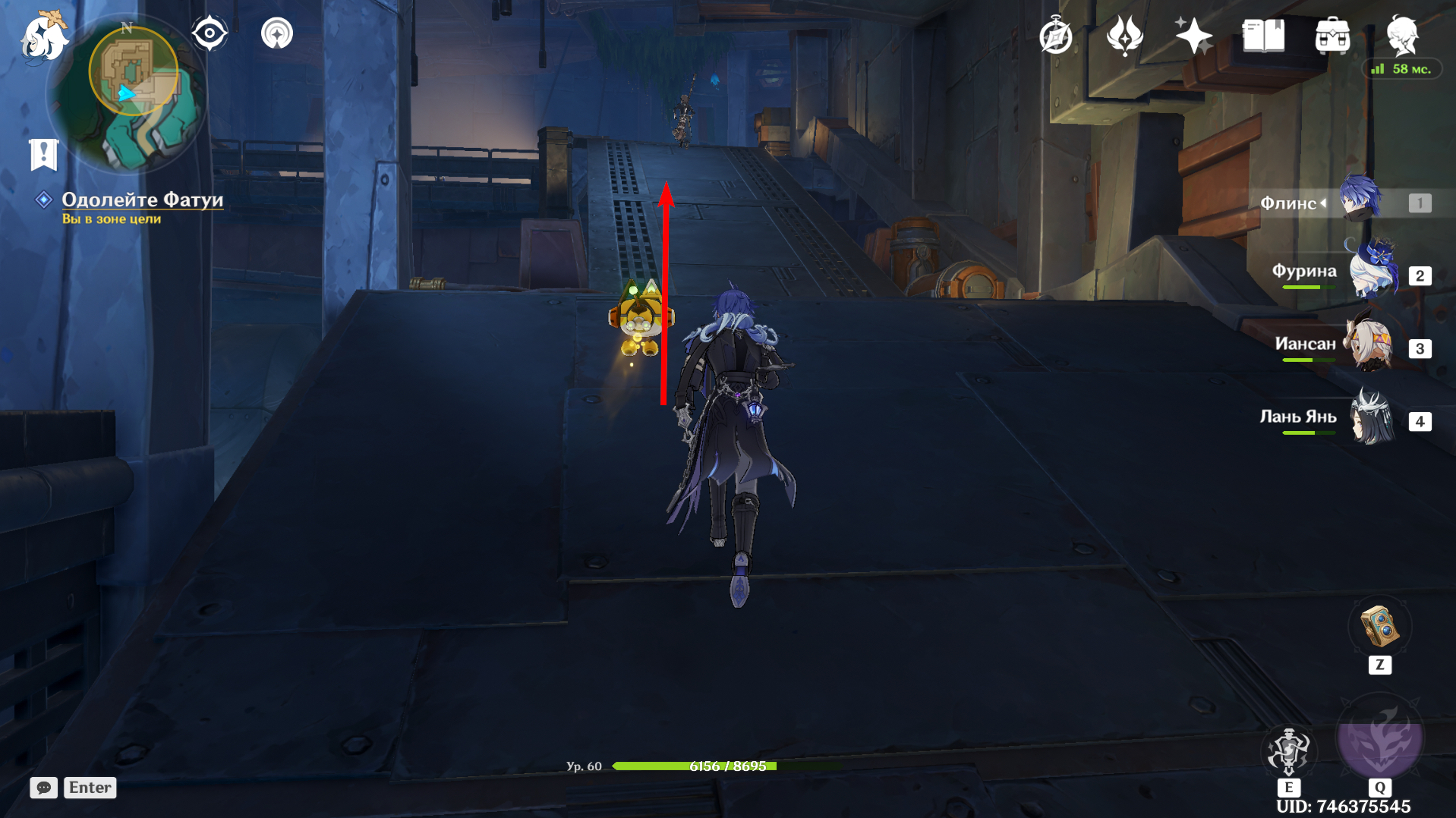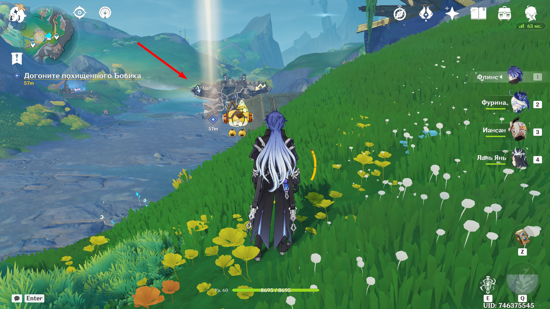 Продолжайте путь дальше, после чего спрыгните ещё на уровень ниже и поговорите с NPC. Победите группу Фатуи, после чего следуйте за Маколой. Вновь одолейте противников во главе с Аллочкой и перезапустите Бобика.