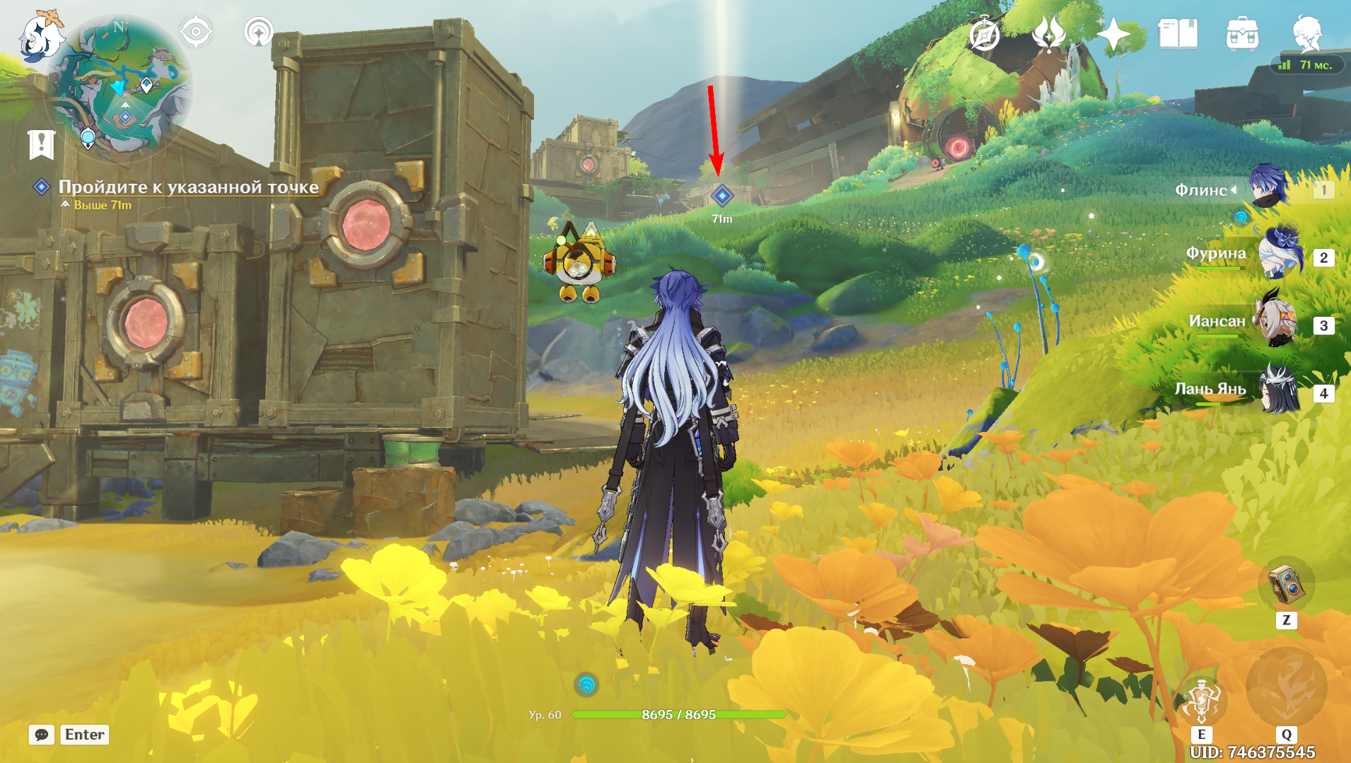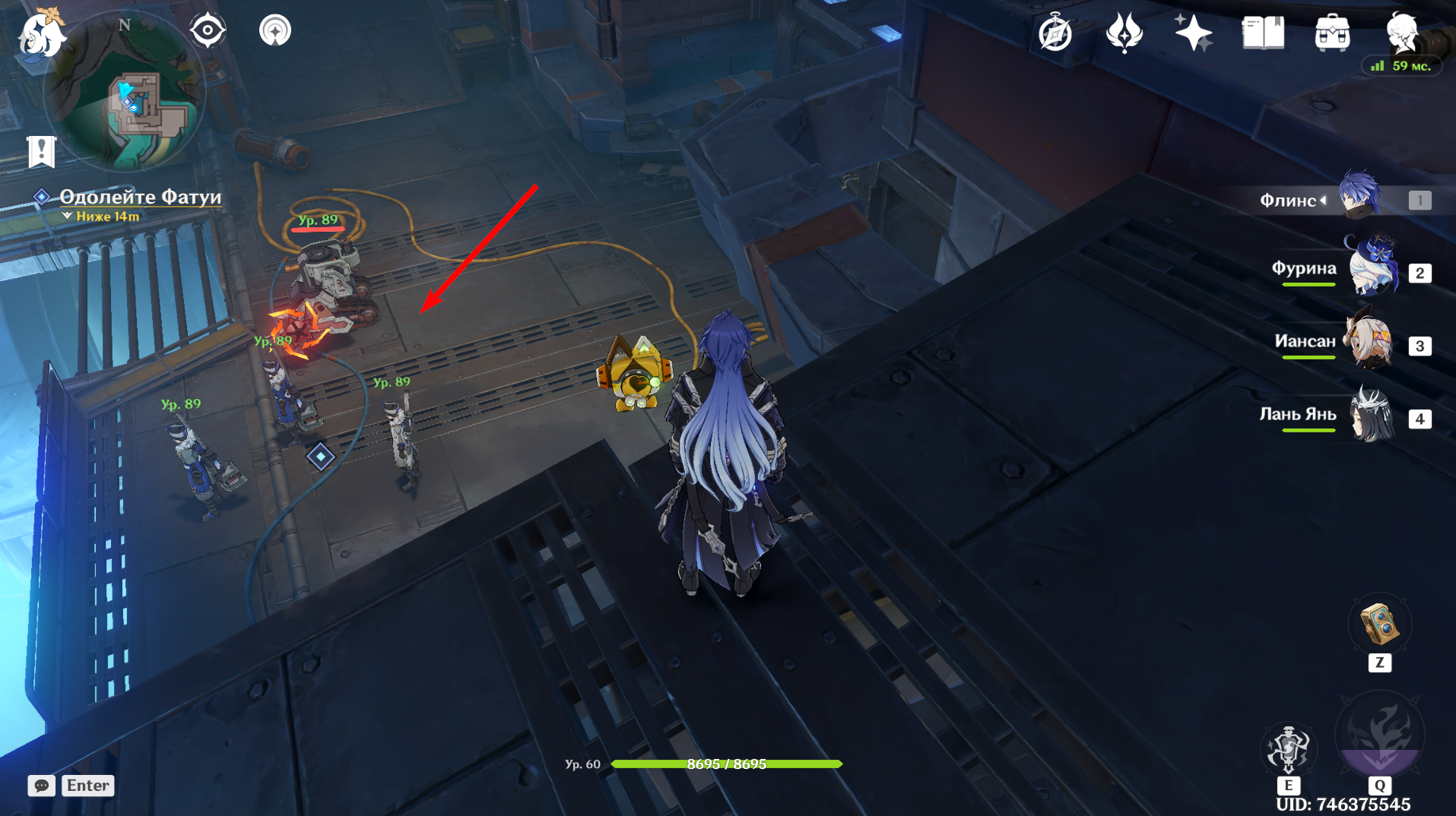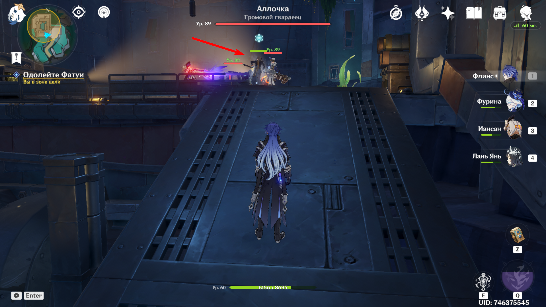 Продолжайте путь дальше, после чего спрыгните ещё на уровень ниже и поговорите с NPC. Победите группу Фатуи, после чего следуйте за Маколой. Вновь одолейте противников во главе с Аллочкой и перезапустите Бобика.