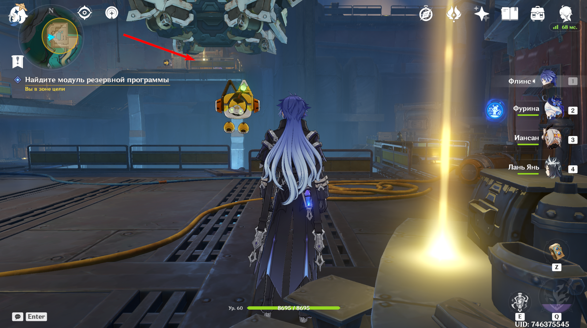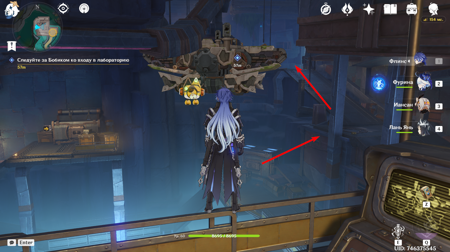 Поднимитесь на платформу выше, где стоит робот с указательной стрелкой. Взаимодействуйте с рабочим местом рядом и перезапустите Бобика.