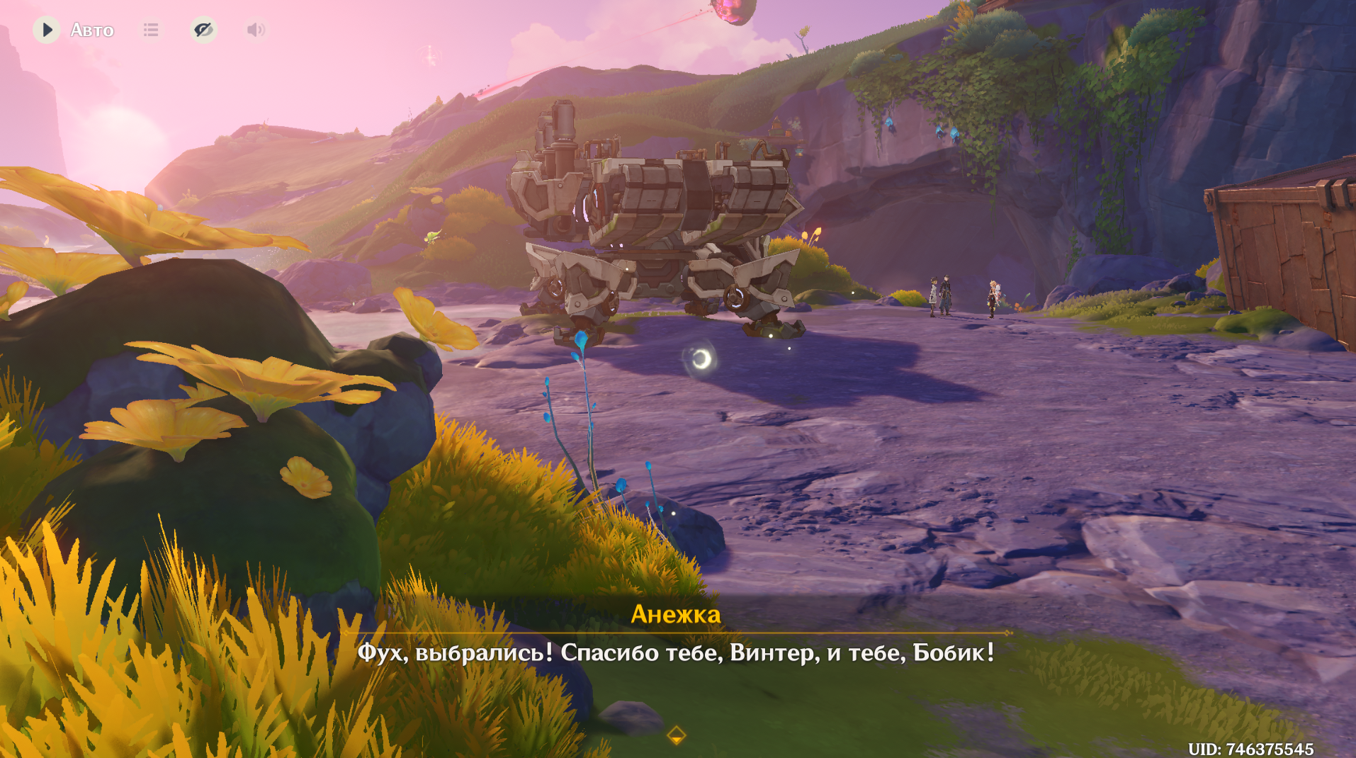 Переместитесь в локацию «Мшистые пустоши», использовав телепорт чуть южнее, и сразу же напротив точки увидите большой сухопутный крейсер — Бобик. На карте же появится маркер мирового квеста. Обойдите механизм и увидите двух NPC, после чего миссия начнётся автоматически.