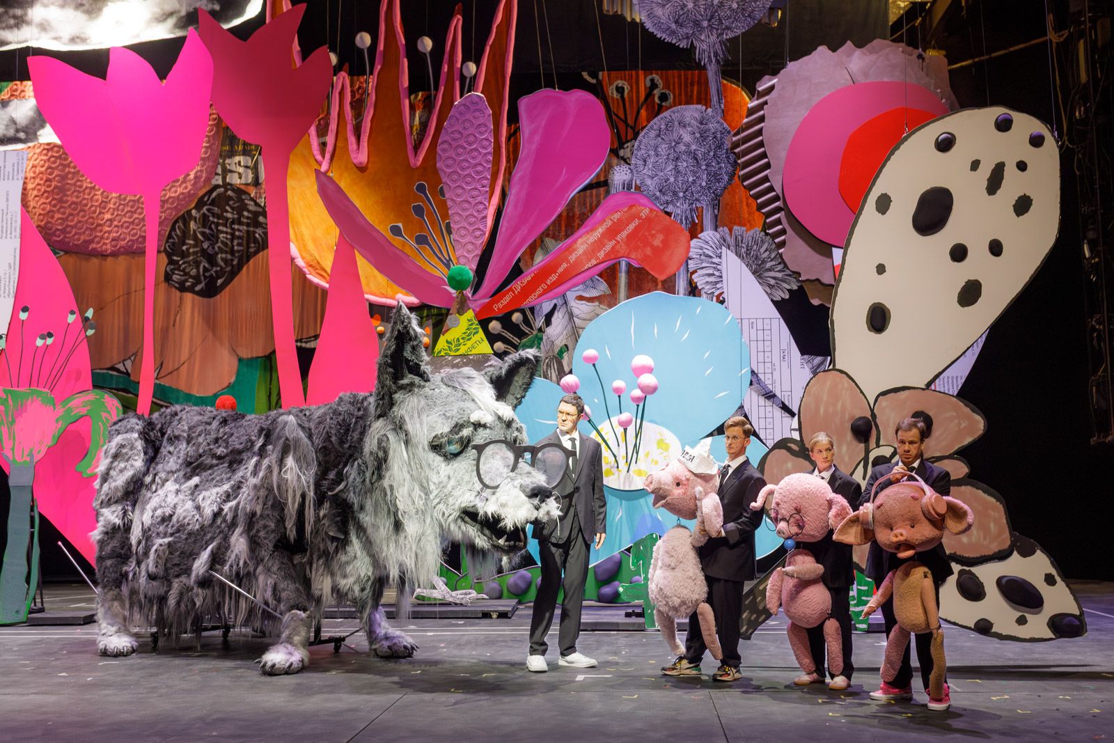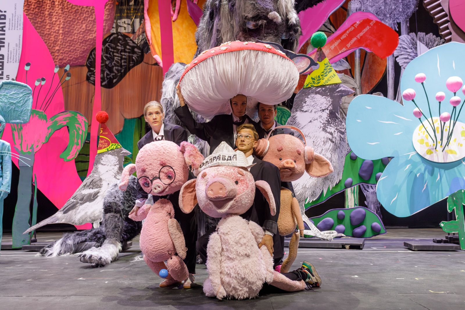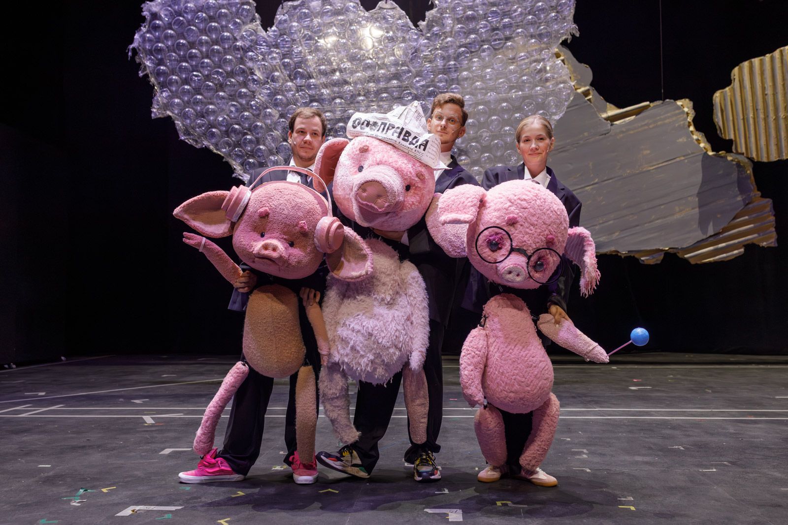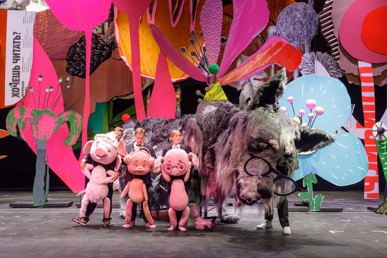 Сделать спектакль, который будет одинаково интересен и детям, и взрослым, — сложная задача. В новой постановке много отсылок — и к современному кино, и к системе Станиславского, и к искусству как системе (один поросенок любит искусство и строит хлипкий Дом культуры), и к театральному производству (второй поросенок строит дом из реквизита, который нашел за сценой). На зрителя вдруг в буквальном смысле вываливаются то три сестры, то три мушкетера. Во всем есть ирония, добрые шутки, но чередование того, что понятно только взрослым, и того, что точно захватывает внимание детей, настолько быстрое, что ни первые, ни вторые не успевают соскучиться.