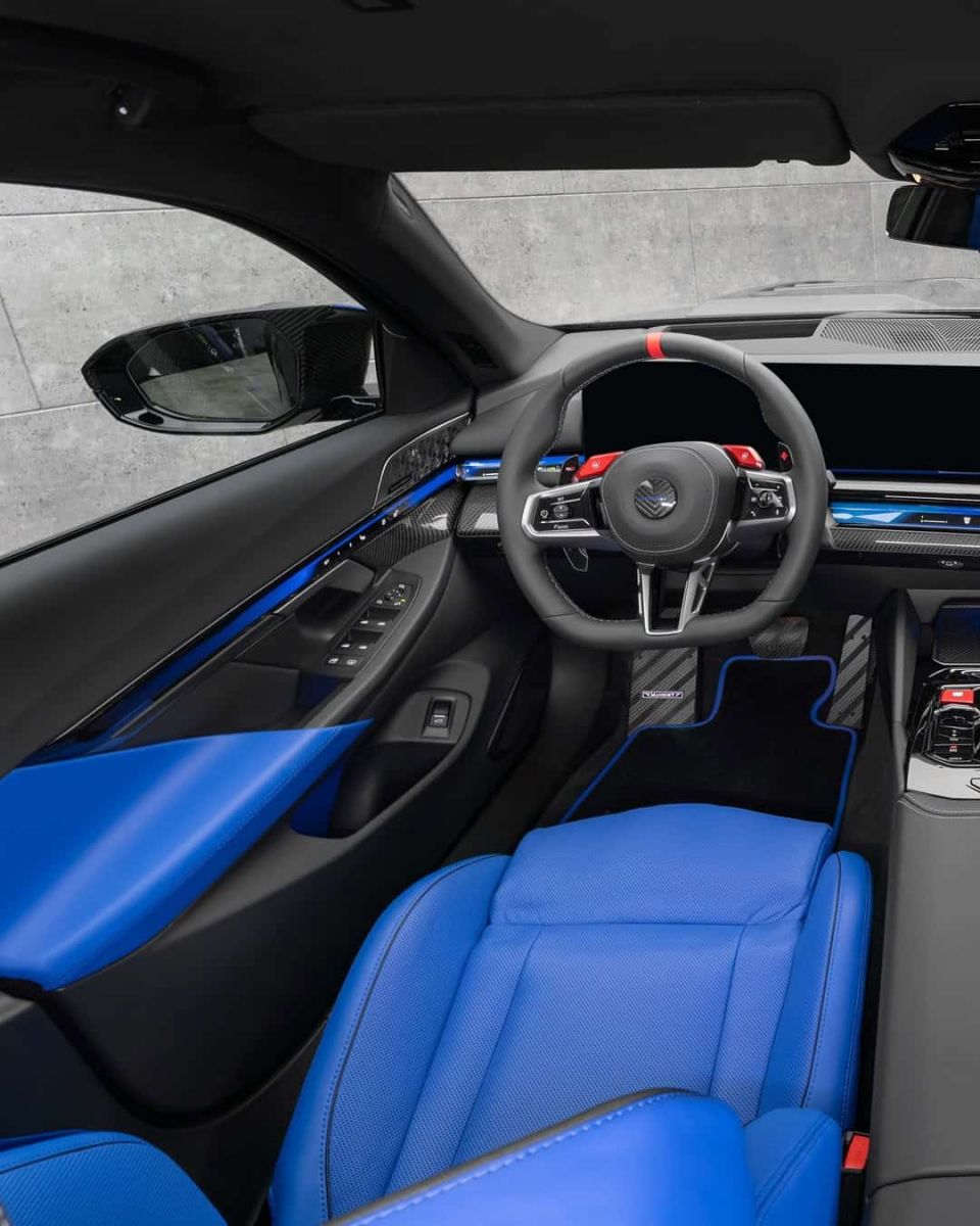 Не обошлось и без неожиданных решений. За знаменитым изгибом Хофмайстера на задней стойке теперь красуется вставка из карбона с подсвеченным логотипом Mansory, а на кромке крыши установлен небольшой спойлер — редкое зрелище для седанов. Передние крылья также получили дополнительные карбоновые панели за колёсными арками, украшенные фирменной подсветкой.