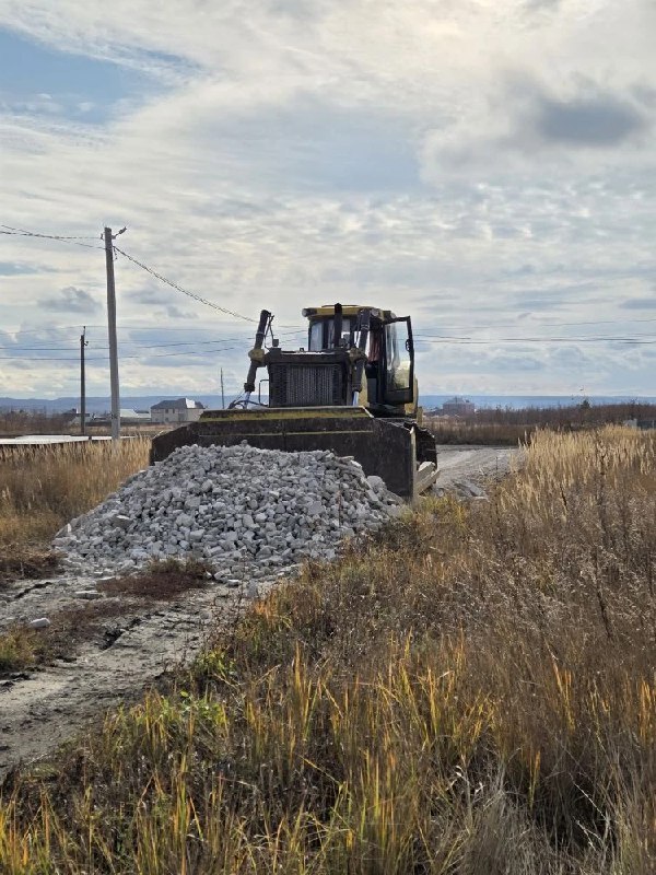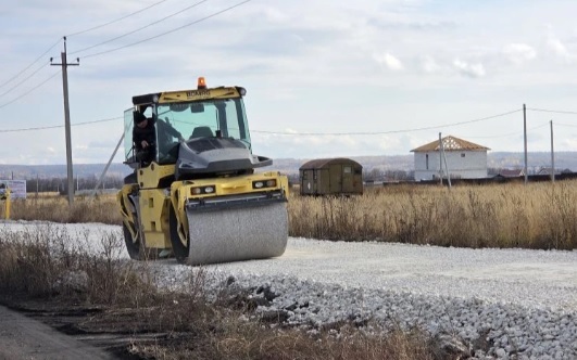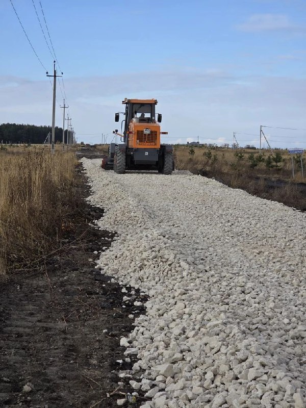 Фракция 40х70 мм разравнивалась при помощи грейдера и уплотнялась тяжёлым катком. Помимо этого порядка 150 тонн инертного материала завезено для отсыпки 1-го переулка Покровского.